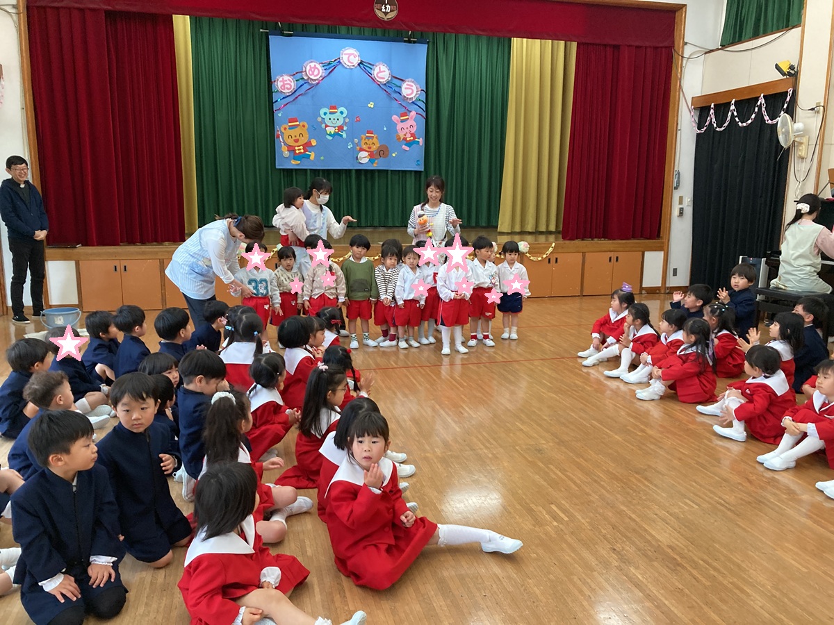 幼稚園では、さくら組、ゆり組のお友だちの1年間のまとめとなる、修了式が行われました。1年間神様に見守っていただいたことに感謝し、お祈りを捧げました。 転園するお友だちへのインタビュー 4月からはきく組さん、さくら組さんですね。元気に登園してきてくださいね🌸