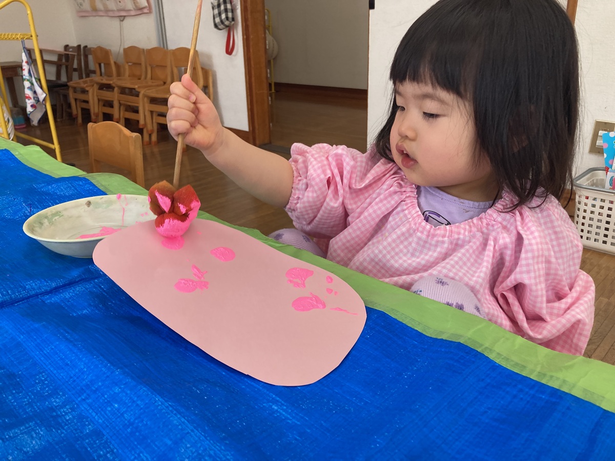 園庭の藤の花の香りが、みんなのことを優しく包んでくれるなか、今日は、初めて絵の具を使って遊びました ♪ 卒園したお友だちがプレゼントしてくれたお仕事着を着て、スポンジ筆🖌を使って『イチゴ』を表現🍓 完成をお楽しみに! その後は、部屋で好きなおもちゃで楽しみました ☆ 明日も、いっぱい遊ぼうね~ ♡