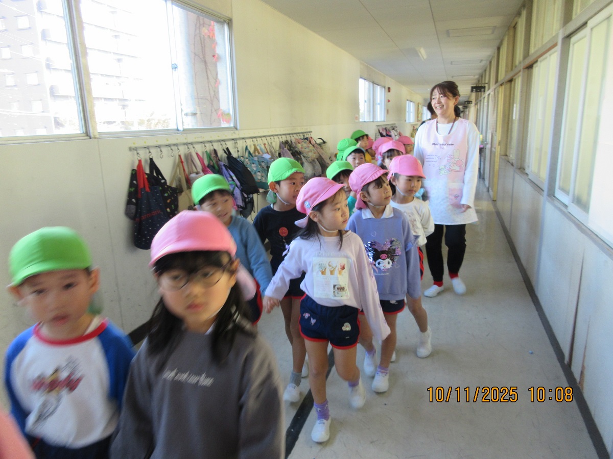 今日はお友だちが楽しみにしていた向山小学校の見学に出かけました♫4月からいよいよ1年生になるきく組のお友だちは、小学校への期待を胸に元気に出発‼小学校に着くと、優しいお兄さん、お姉さんたちが駆け寄ってきてくれて笑顔があふれていました。小学校の先生に案内をしていただき、理科室や家庭科室、一年生の教室などを見学して目を輝かせていました💗小学校への期待がますますふくらむ楽しい時間になりました(^^♪