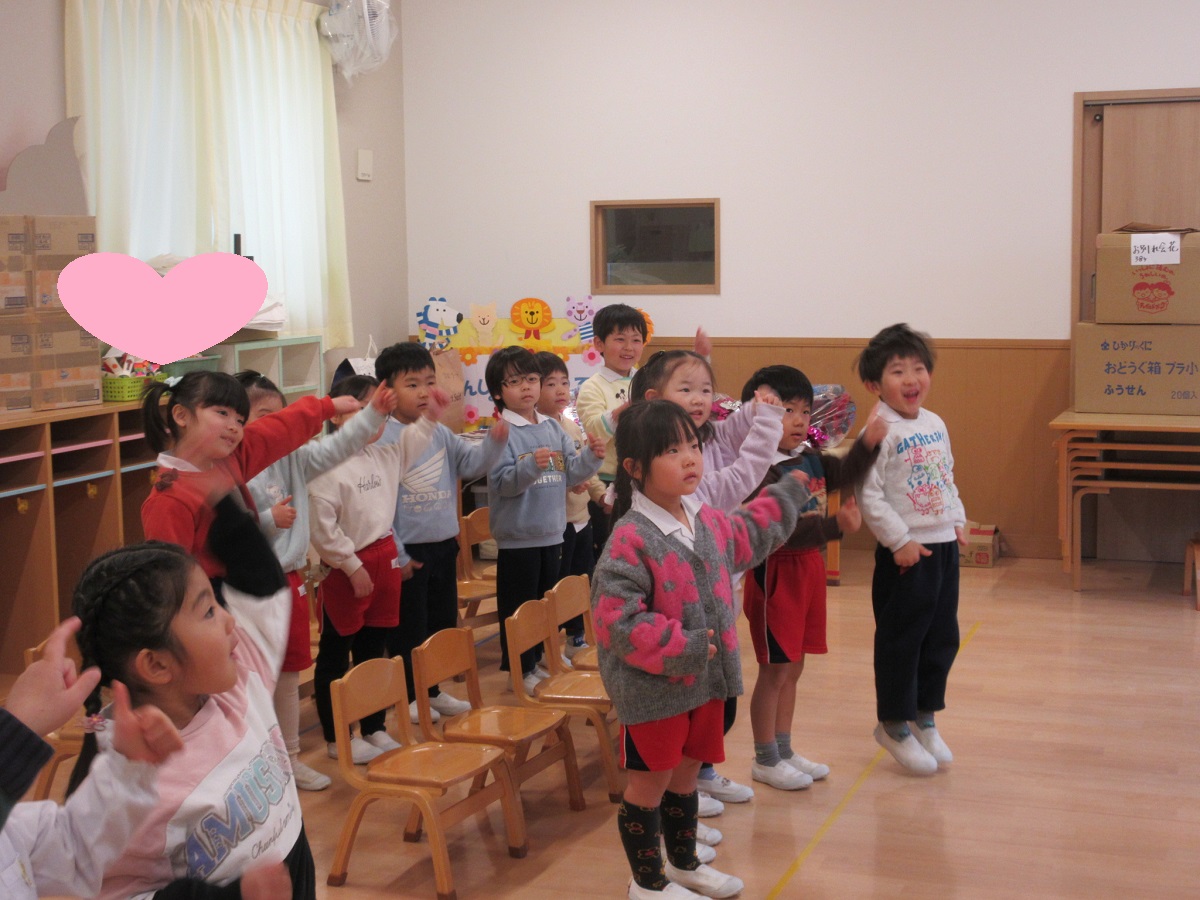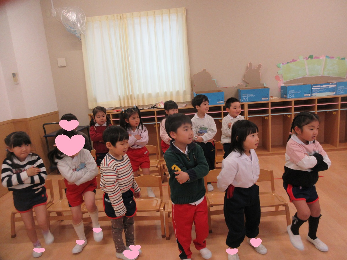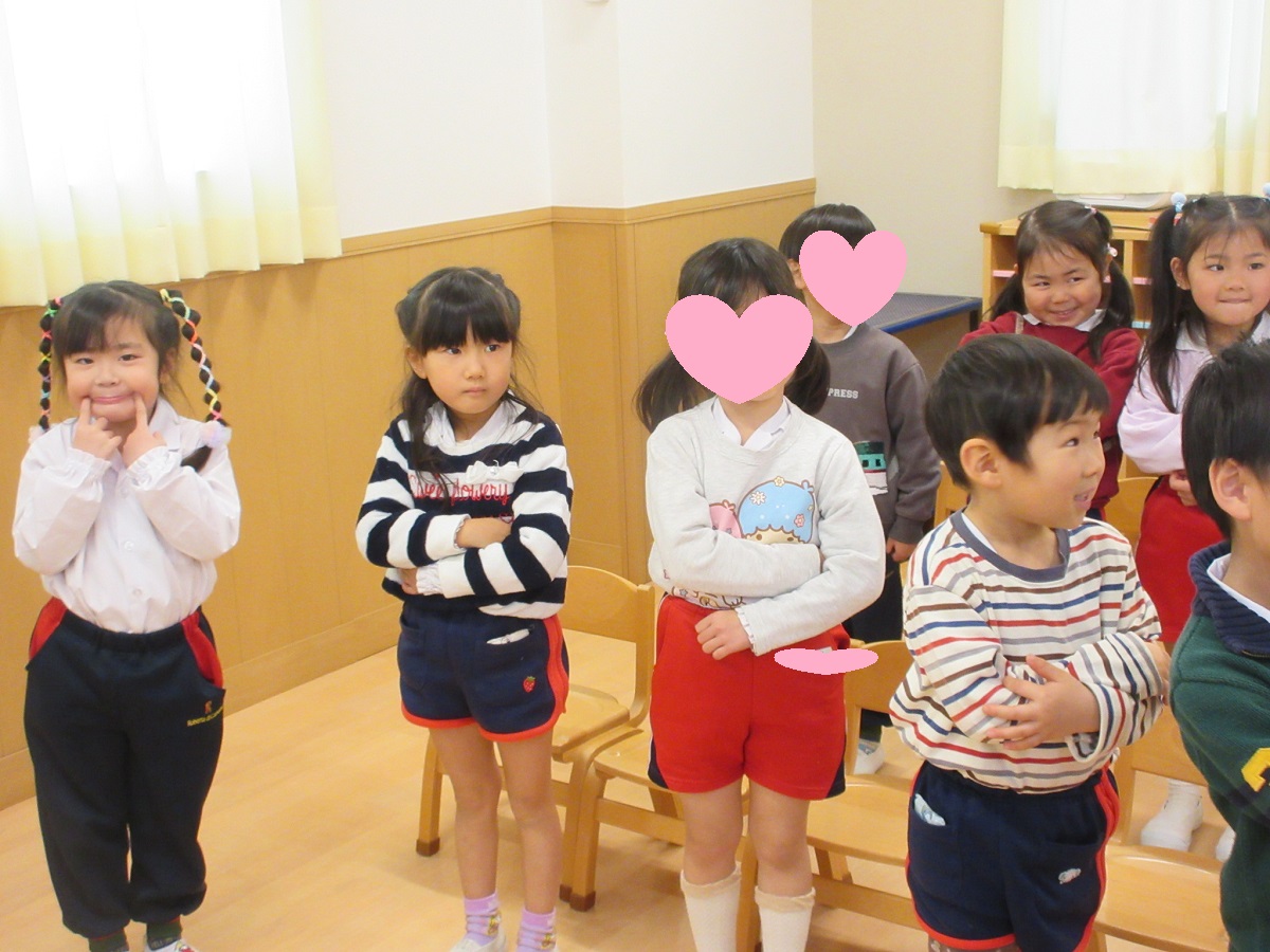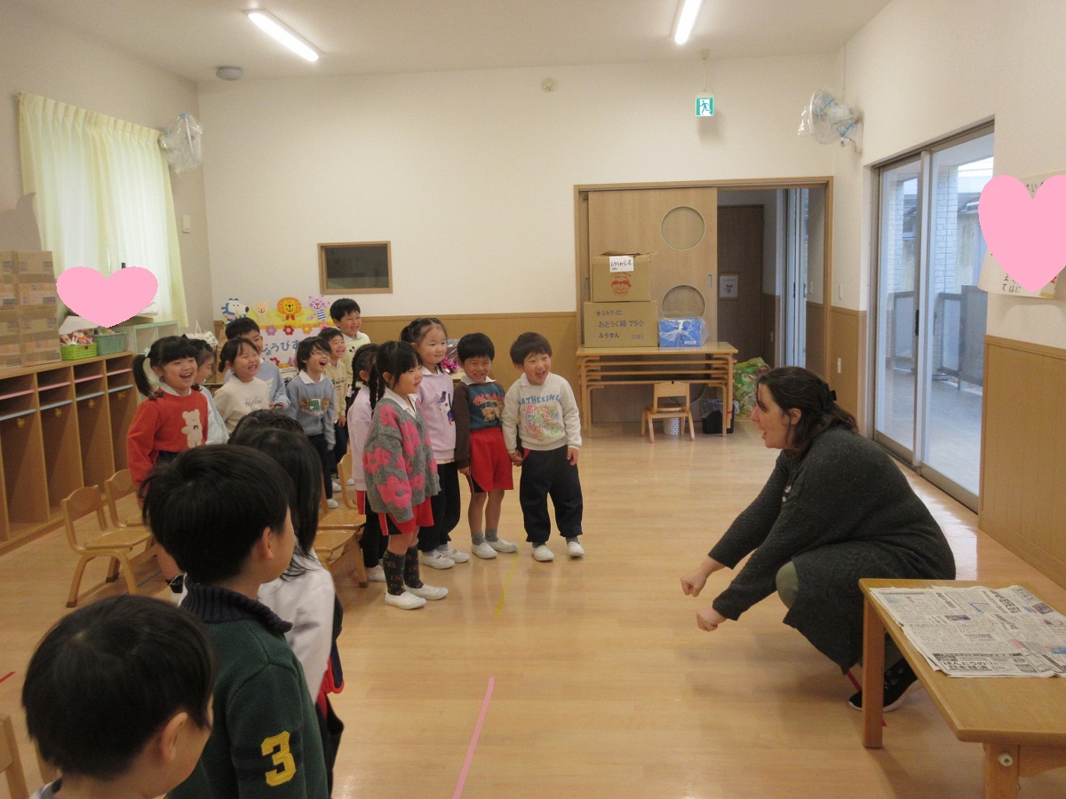 さくら組では、英語であそぼうの時間がありました。久しぶりの英語の時間をとても楽しみにしていたお友だち♡J先生の話す単語を繰り返したり、英語の曲に合わせて体を動かしたり、満面の笑みを浮かべながら楽しんでいました♪