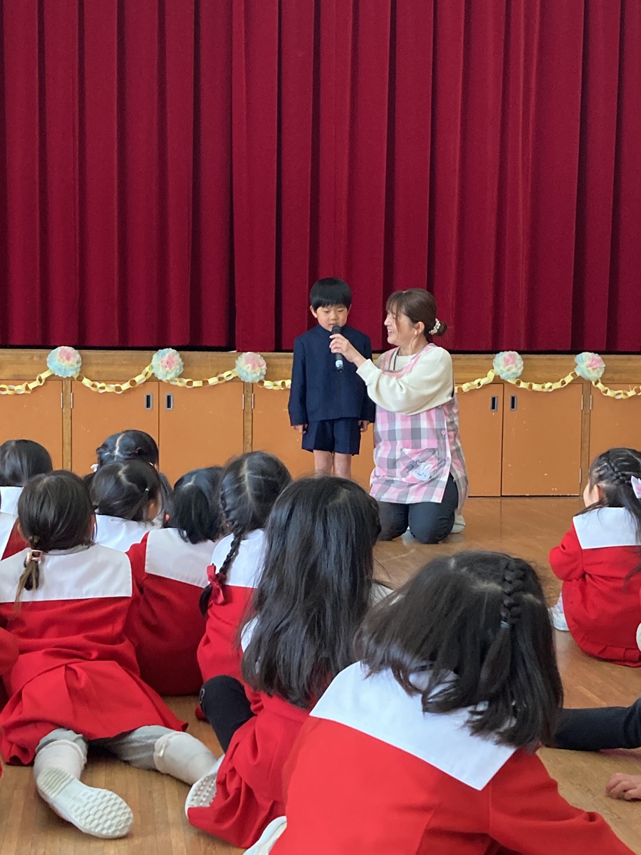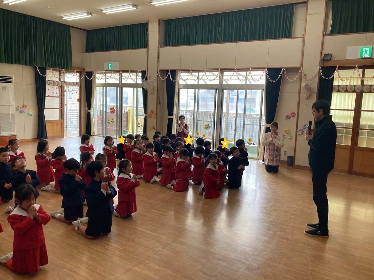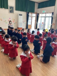 幼稚園では、さくら組、ゆり組のお友だちの1年間のまとめとなる、修了式が行われました。1年間神様に見守っていただいたことに感謝し、お祈りを捧げました。