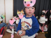 太鼓の合図と共に、登場した赤鬼・青鬼にびっくりしながらも、新聞紙の豆を「えいっ!」と投げて一生懸命退治しようとしていました !(^^)!