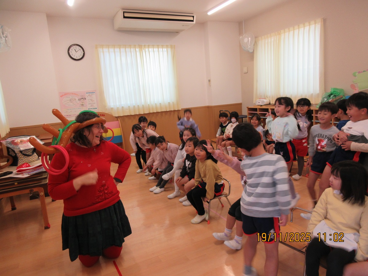 今日は、J先生による英語で遊ぼうの時間がありました。 赤と緑の服を見にまとい、クリスマスをとても楽しみにしている愉快な先生の姿を見て、すっかりクリスマス気分なお友だち♪クリスマスの絵本を見ながら、トナカイの数や欲しいプレゼントなどについて考えていました。他にもアメリカのクリスマスについてのお話しを聞いたり、トナカイに変身したJ先生の角に輪をかけるゲームをした ……