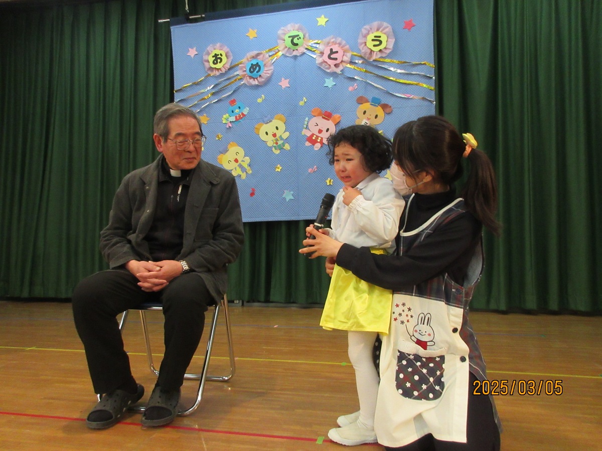今日幼稚園では、もうすぐ卒園式を迎えるきく組さんのお別れ会をしました。遊戯室でさくら組さんゆり組さんに迎えられ、緊張した様子でしたが、さすがきく組さん!かっこよく入場出来ましたね。そして、楽しいお楽しみ会のはじまりはじまり・・・みんな終始笑顔の楽しい時間になりました。