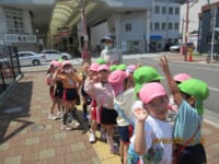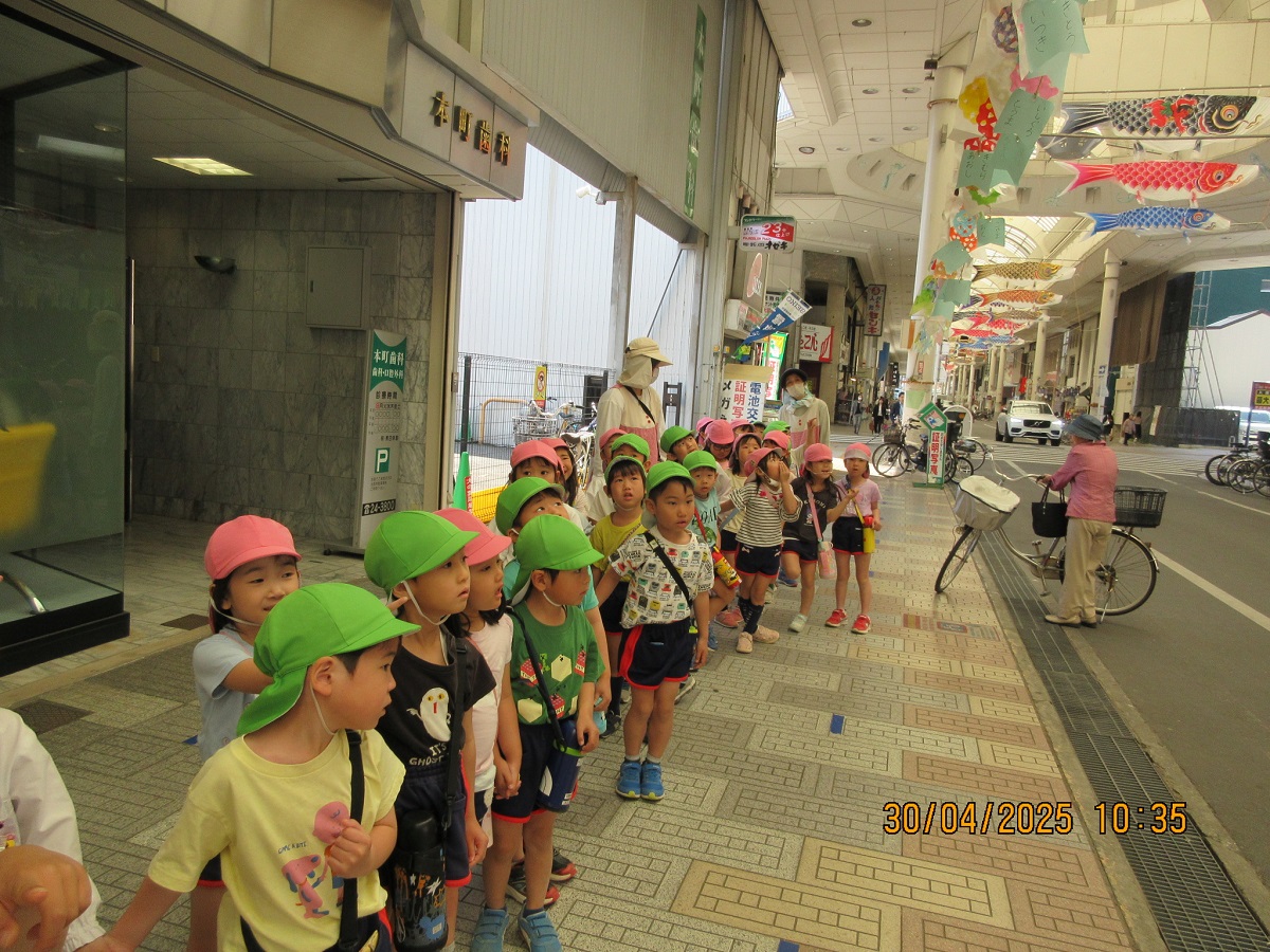 朝晩は冷えますが日中はぐんぐん気温が上がり今日は夏のような暑さになりましたね。今日きく組は、園バスに乗ってこいのぼりを見に本町通りに行って来ました。色とりどりのこいのぼりにみんな「きれいだね〜。幼稚園のこいのぼりと一緒だね。」などと楽しそうにこいのぼりを見ていました。