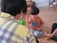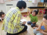 タンブリンは、Ⅰ先生の叩くリズムを真似て「は~い」と返事をしながら、叩き返したり…