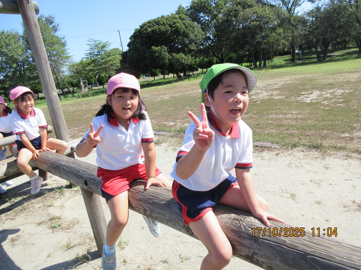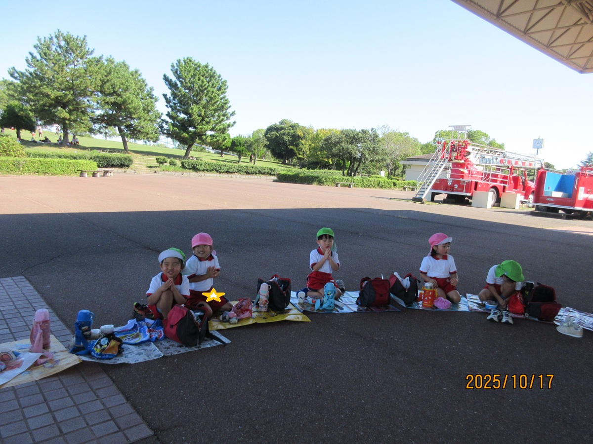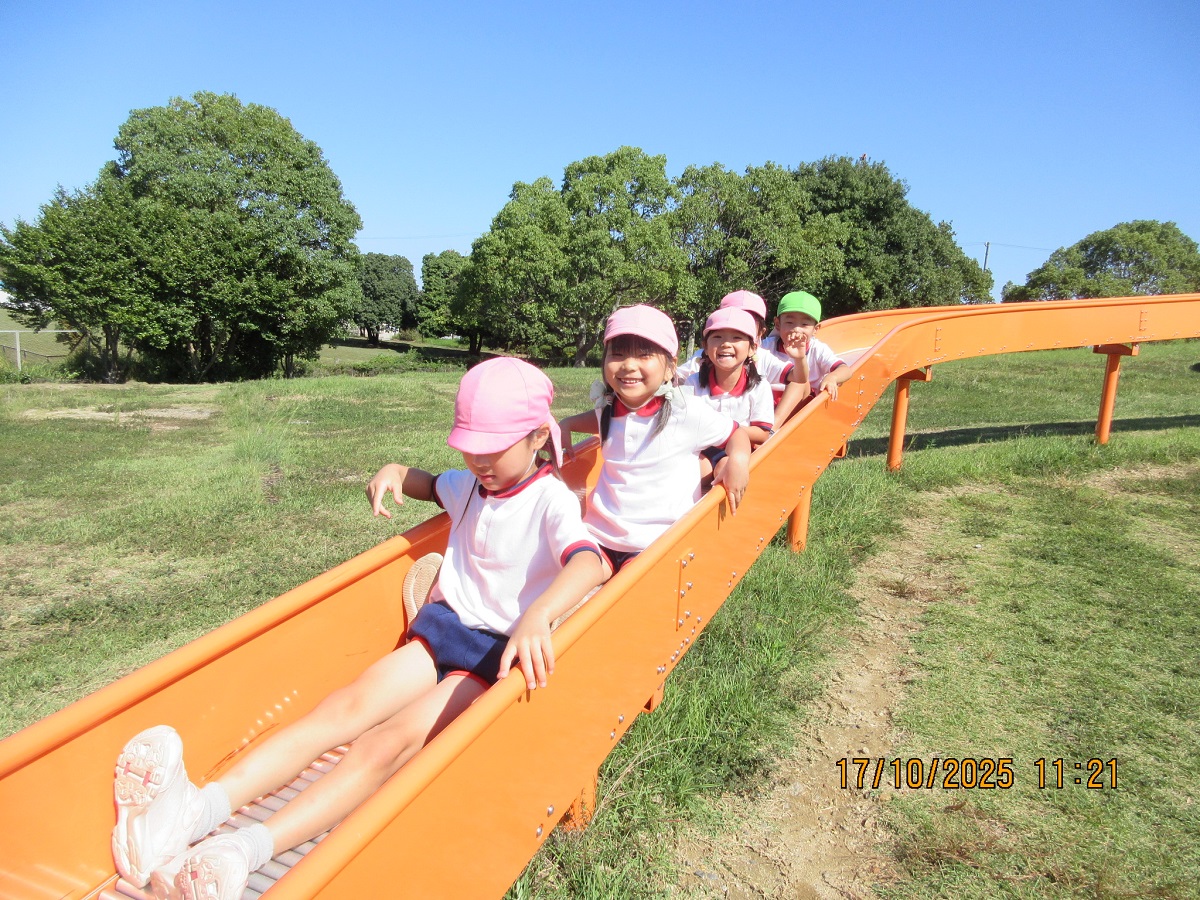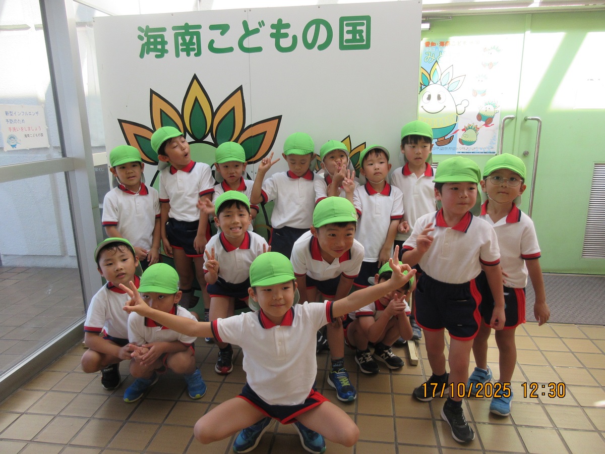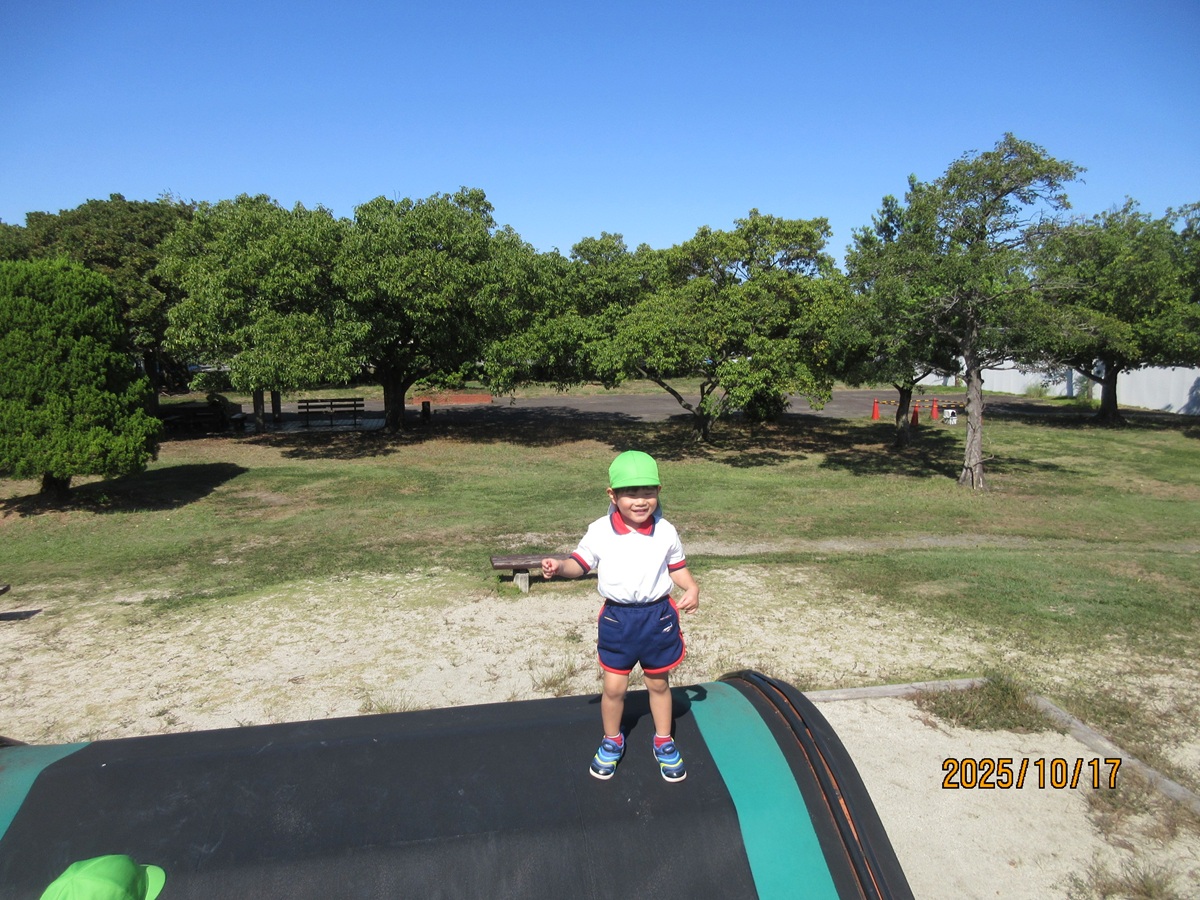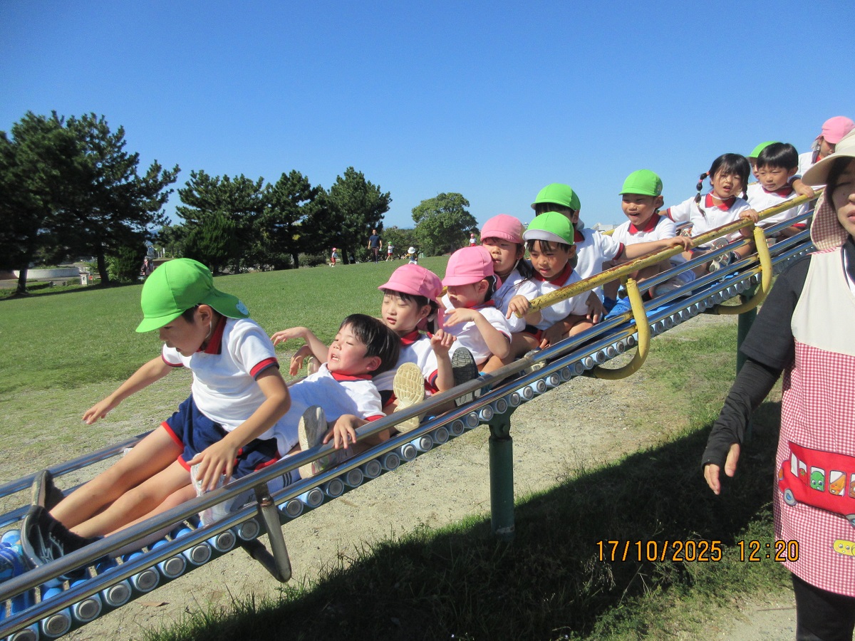 海南子どもの国に到着すると、みどぽんと一緒に記念写真を撮りました(*^_^*)その後は、クラスごとに分かれて思いっきり楽しみました。消防車に乗ったり、長いローラー滑り台を滑ったり、ターザンロープに挑戦したり、幼児コーナーではお友だちと仲良く遊んだり🎶遊具だけではなく、広い自然の中を思いきり走り回る姿も見られ、笑顔でいっぱいでした。たくさん遊んだあとは、秋空の下でお楽しみのおにぎり弁当タイム🍙「美味しいね~💗」と、ニコニコ笑顔が広がり、楽しい会話も弾みました♪お腹も心も満たされたあとは、もうひと遊び‼秋の自然の中でたくさんの笑顔と楽しい思い出がいっぱい💗素敵な一日になりました(*^_^*)