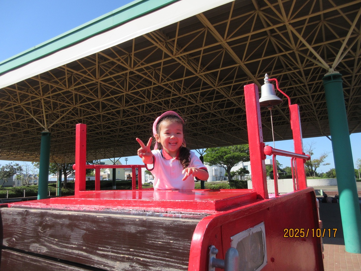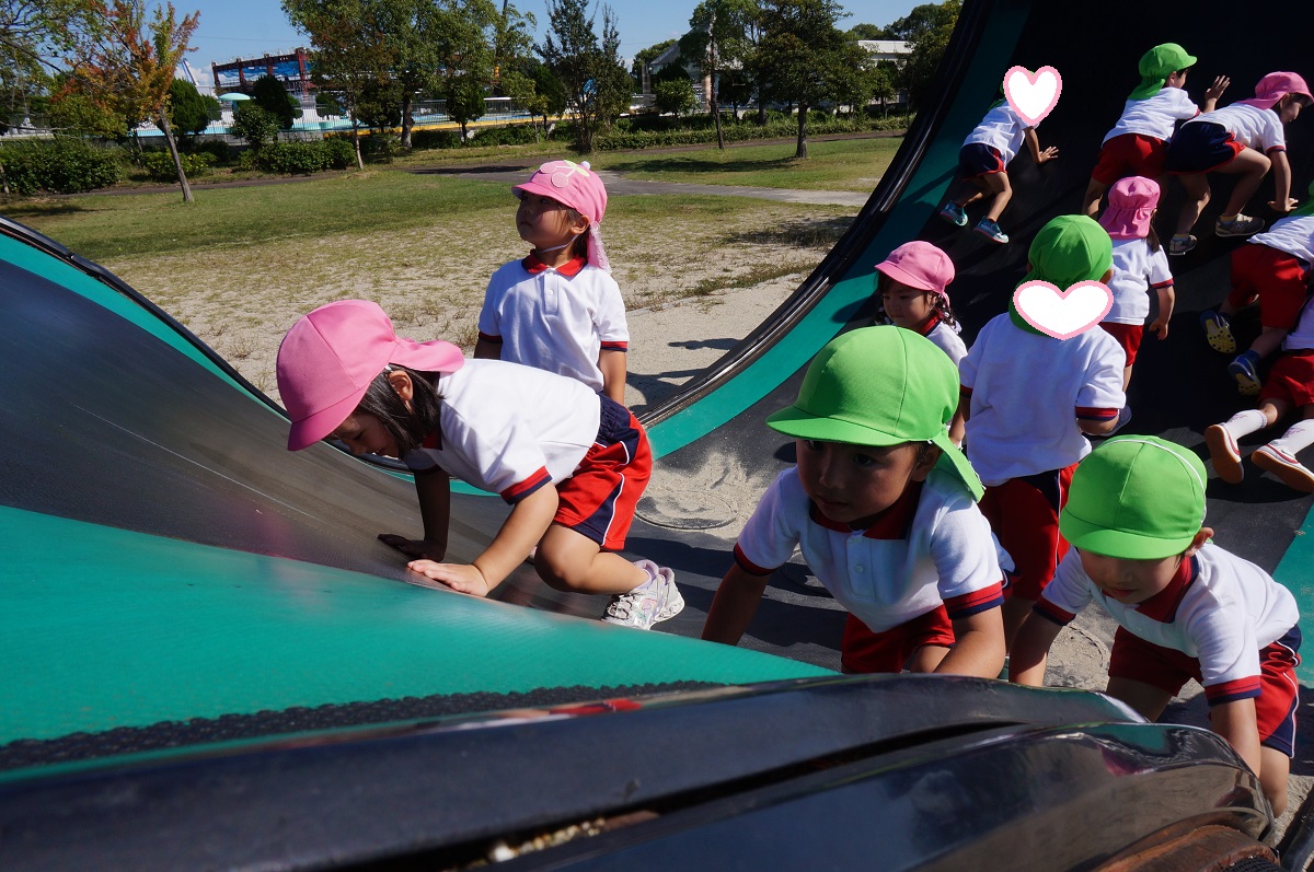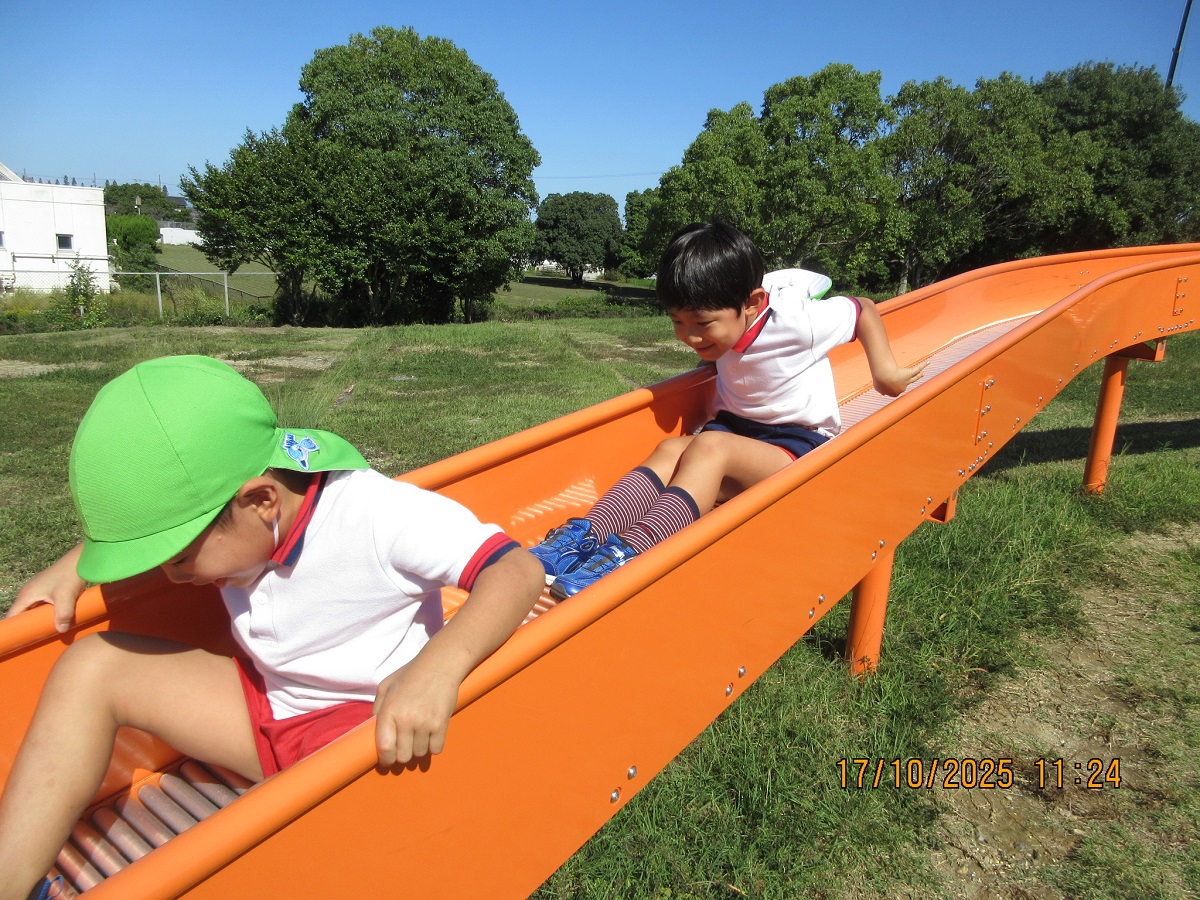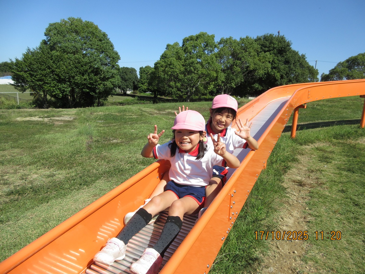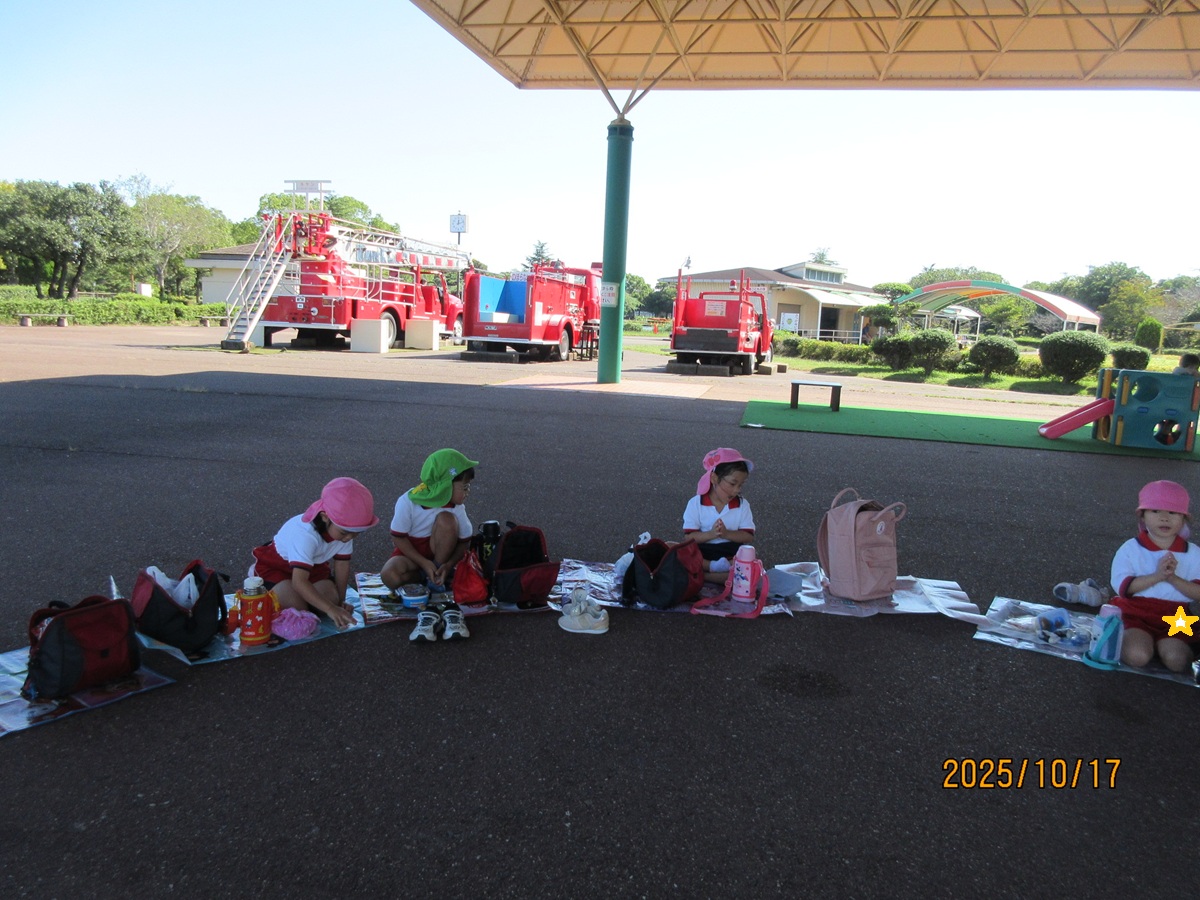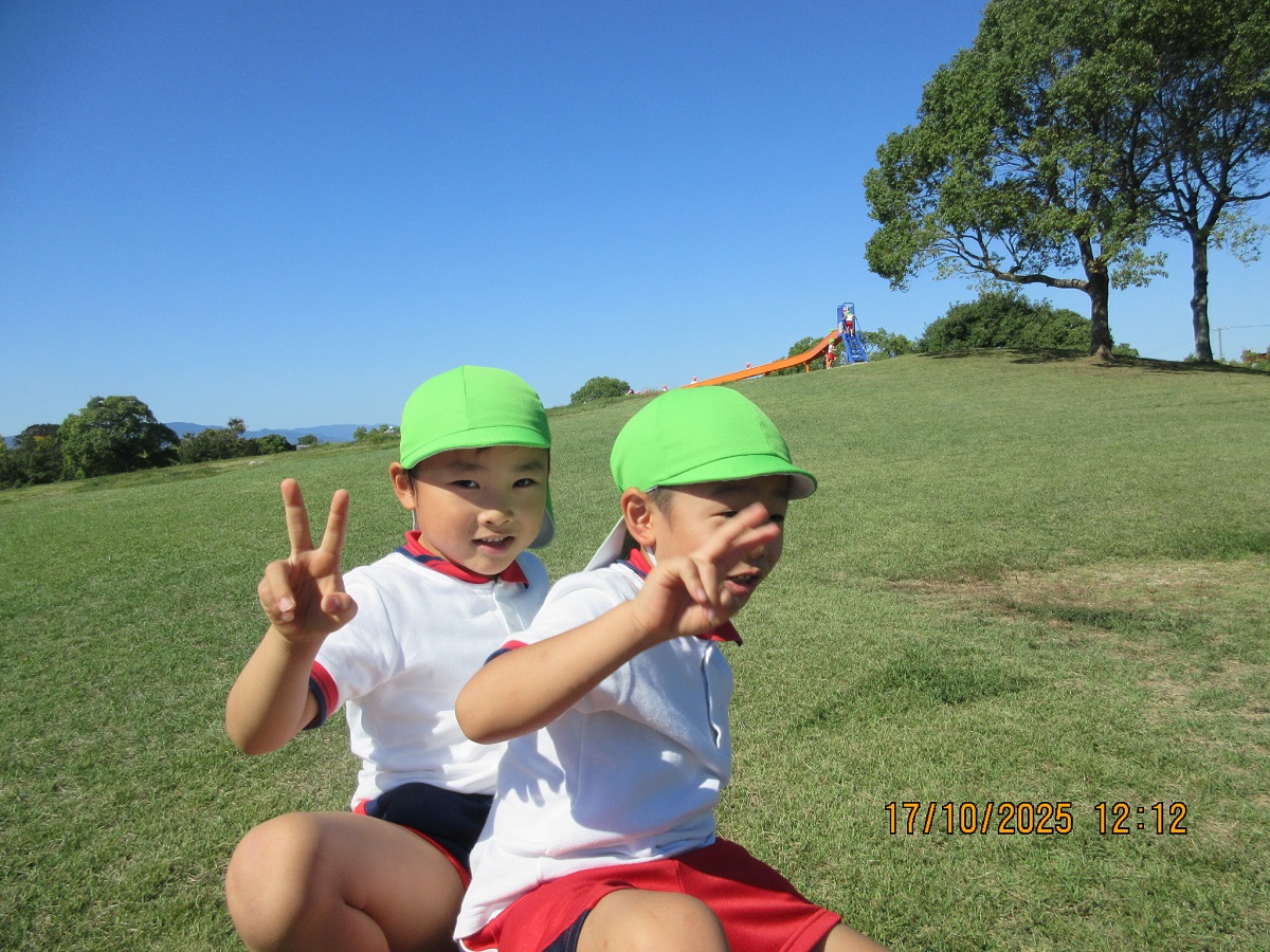 海南子どもの国に到着すると、みどぽんと一緒に記念写真を撮りました(*^_^*)その後は、クラスごとに分かれて思いっきり楽しみました。消防車に乗ったり、長いローラー滑り台を滑ったり、ターザンロープに挑戦したり、幼児コーナーではお友だちと仲良く遊んだり🎶遊具だけではなく、広い自然の中を思いきり走り回る姿も見られ、笑顔でいっぱいでした。たくさん遊んだあとは、秋空の下でお楽しみのおにぎり弁当タイム🍙「美味しいね~💗」と、ニコニコ笑顔が広がり、楽しい会話も弾みました♪お腹も心も満たされたあとは、もうひと遊び‼秋の自然の中でたくさんの笑顔と楽しい思い出がいっぱい💗素敵な一日になりました(*^_^*)