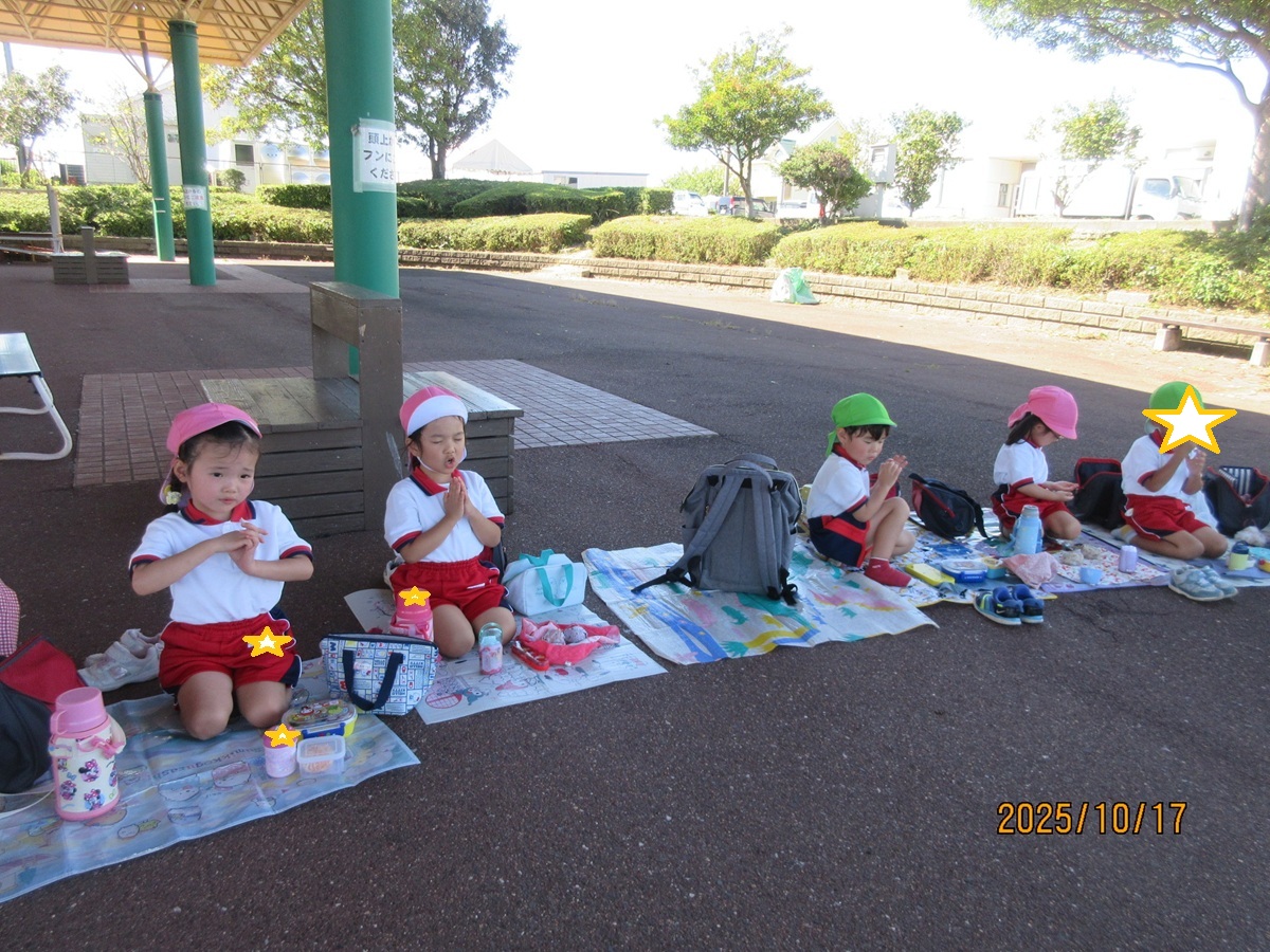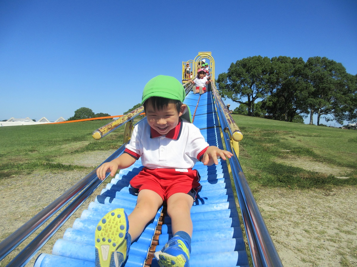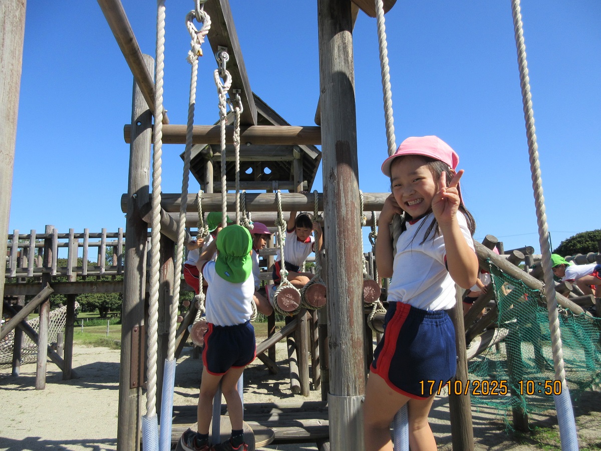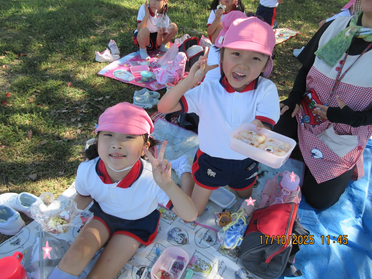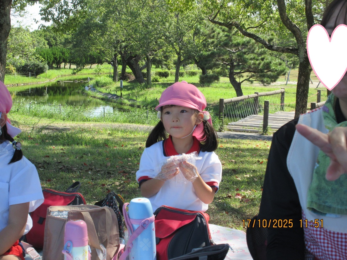 海南子どもの国に到着すると、みどぽんと一緒に記念写真を撮りました(*^_^*)その後は、クラスごとに分かれて思いっきり楽しみました。消防車に乗ったり、長いローラー滑り台を滑ったり、ターザンロープに挑戦したり、幼児コーナーではお友だちと仲良く遊んだり🎶遊具だけではなく、広い自然の中を思いきり走り回る姿も見られ、笑顔でいっぱいでした。たくさん遊んだあとは、秋空の下でお楽しみのおにぎり弁当タイム🍙「美味しいね~💗」と、ニコニコ笑顔が広がり、楽しい会話も弾みました♪お腹も心も満たされたあとは、もうひと遊び‼秋の自然の中でたくさんの笑顔と楽しい思い出がいっぱい💗素敵な一日になりました(*^_^*)