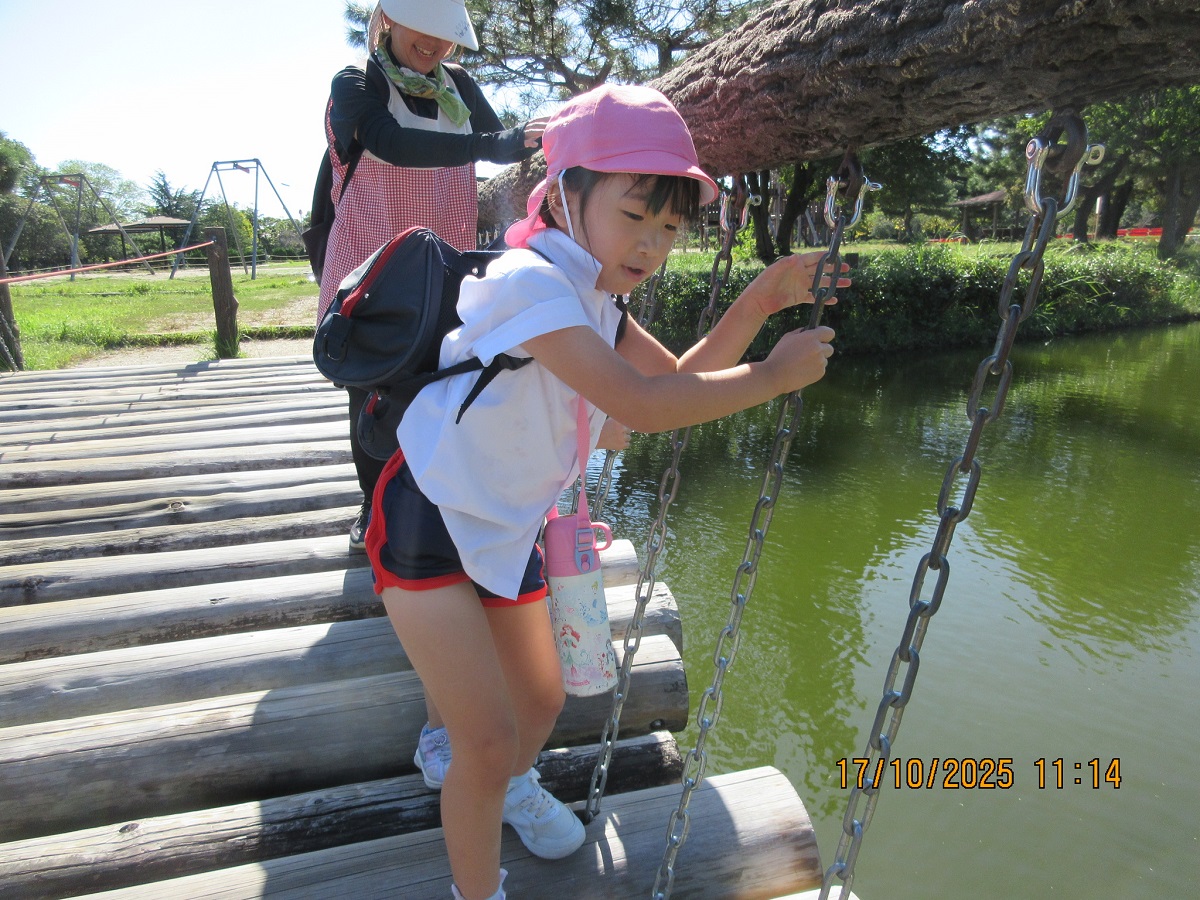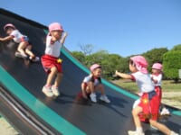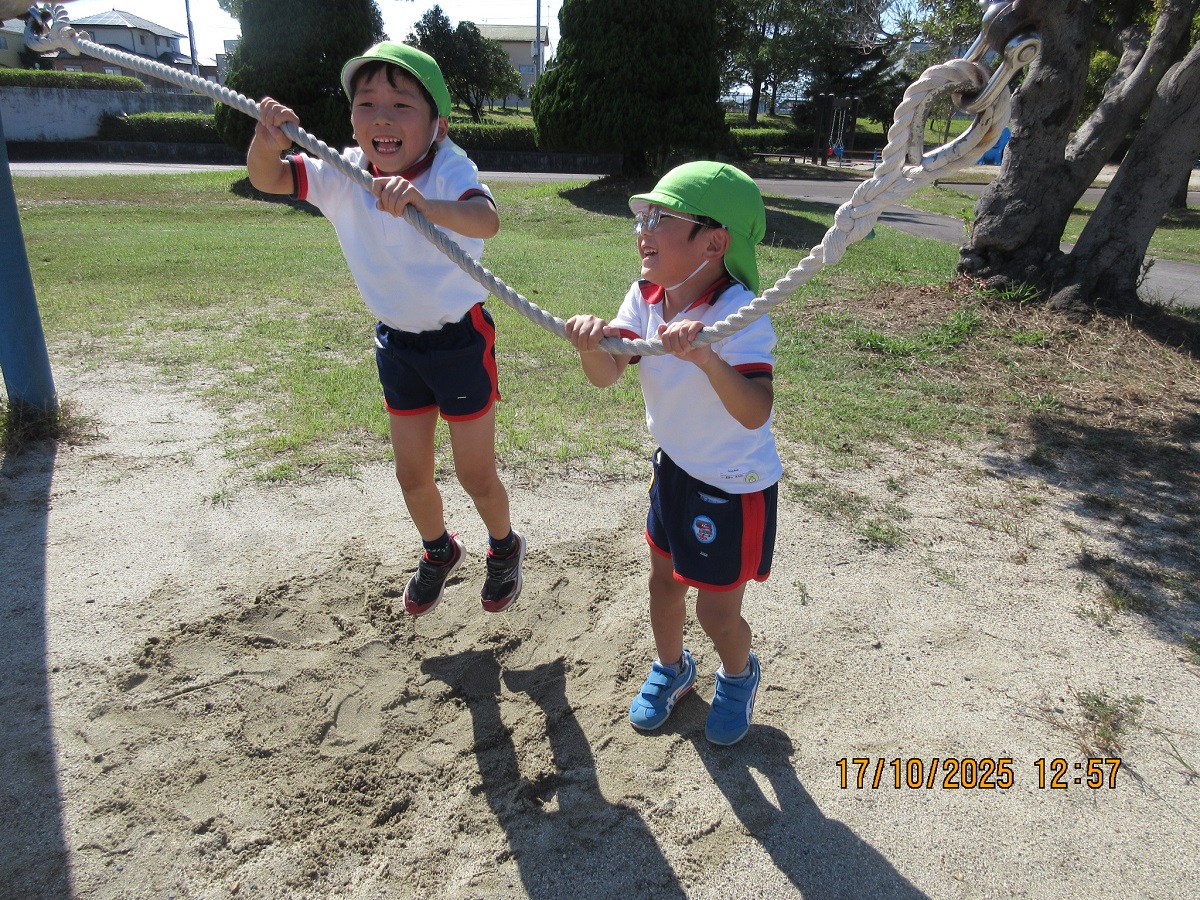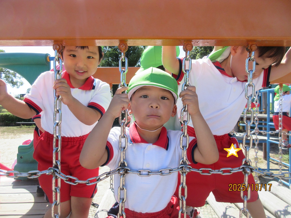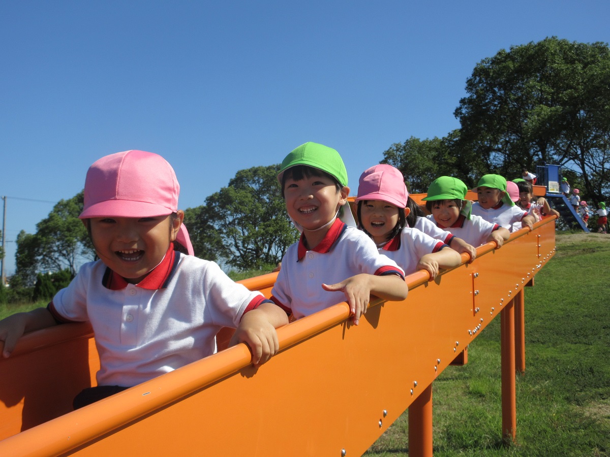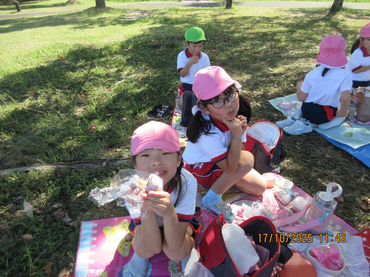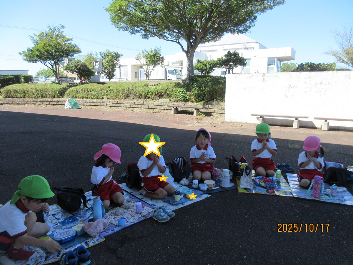 海南子どもの国に到着すると、みどぽんと一緒に記念写真を撮りました(*^_^*)その後は、クラスごとに分かれて思いっきり楽しみました。消防車に乗ったり、長いローラー滑り台を滑ったり、ターザンロープに挑戦したり、幼児コーナーではお友だちと仲良く遊んだり🎶遊具だけではなく、広い自然の中を思いきり走り回る姿も見られ、笑顔でいっぱいでした。たくさん遊んだあとは、秋空の下でお楽しみのおにぎり弁当タイム🍙「美味しいね~💗」と、ニコニコ笑顔が広がり、楽しい会話も弾みました♪お腹も心も満たされたあとは、もうひと遊び‼秋の自然の中でたくさんの笑顔と楽しい思い出がいっぱい💗素敵な一日になりました(*^_^*)