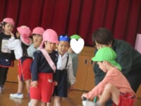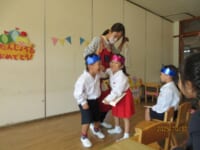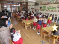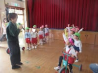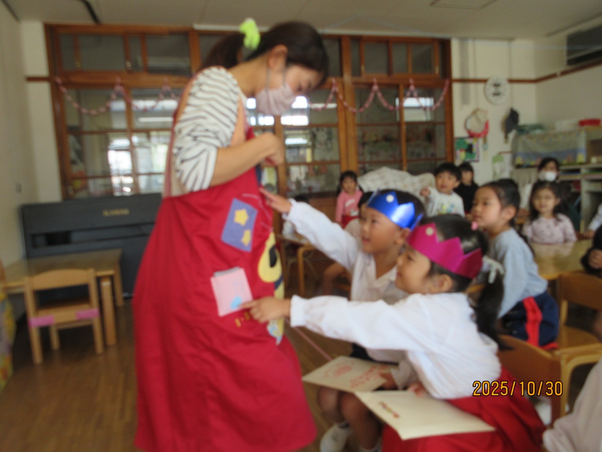 ใƒ—ใƒฌใ‚ผใƒณใƒˆใฎๆญŒใฎๅพŒใฏใŠๆฅฝใ—ใฟใฎๆ™‚้–“ใงใ™ใ€‚ใ€Œ🎵ใพใปใ†ใฎใพใ‚‹ใƒปใ•ใ‚“ใ‹ใใƒปใ—ใ‹ใ🎵ใ€ใฎใŠ่ฉฑใ‚’ใ—ใพใ—ใŸใ€‚ใƒใ‚ฑใƒƒใƒˆใ‹ใ‚‰ๅ‡บใฆใใ‚‹ใ€ใพใ‚‹ใƒปใ•ใ‚“ใ‹ใใƒปใ—ใ‹ใใŒๅธฝๅญใฎไธญใซๅ…ฅใ‚‹ใจโ€ฆใ‚ใ‚‰ใตใ—ใŽ๏ผ๏ผŸ็”Ÿใ็‰ฉใ‚„้ฃŸใน็‰ฉใชใฉใซๅค‰่บซใ—ใฆใ—ใพใ†ใฎใงใ™ใ€‚ใ€Œใกใกใ‚“ใทใ„ใทใ„ใฎ๏ฝžใทใ„๏ผใ€ใจ้ญ”ๆณ•ใ‚’ใ‹ใ‘ใ‚‹ใจๅค‰่บซใ™ใ‚‹ใ€ใพใ‚‹ใƒปใ•ใ‚“ใ‹ใใƒปใ—ใ‹ใใซๅญใฉใ‚‚ใŸใกใ‚‚ๅ–œใ‚“ใงใฟใฆใใ‚Œใพใ—ใŸใ€‚