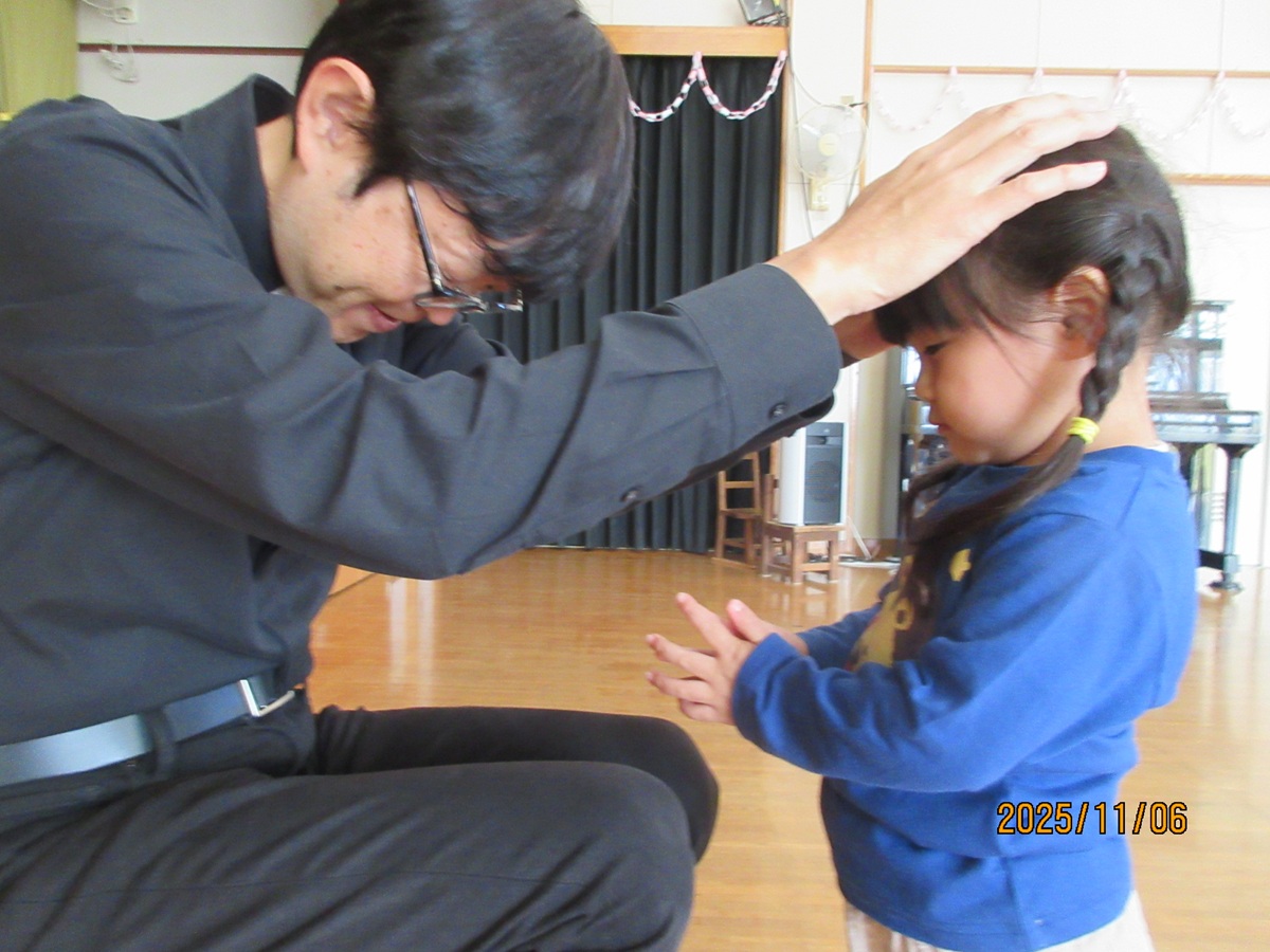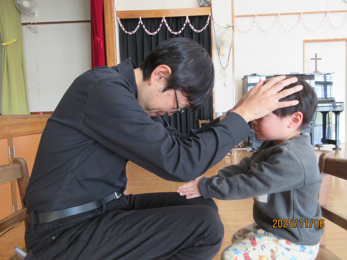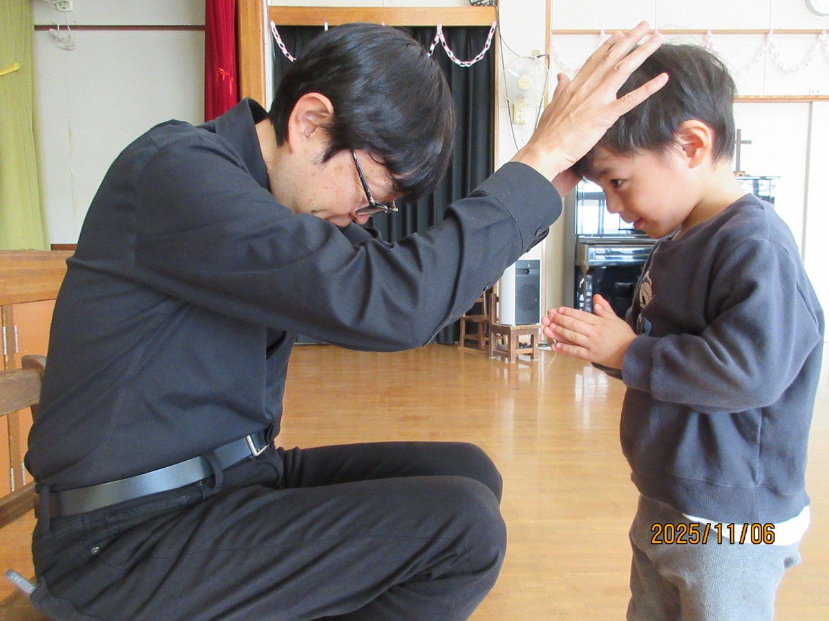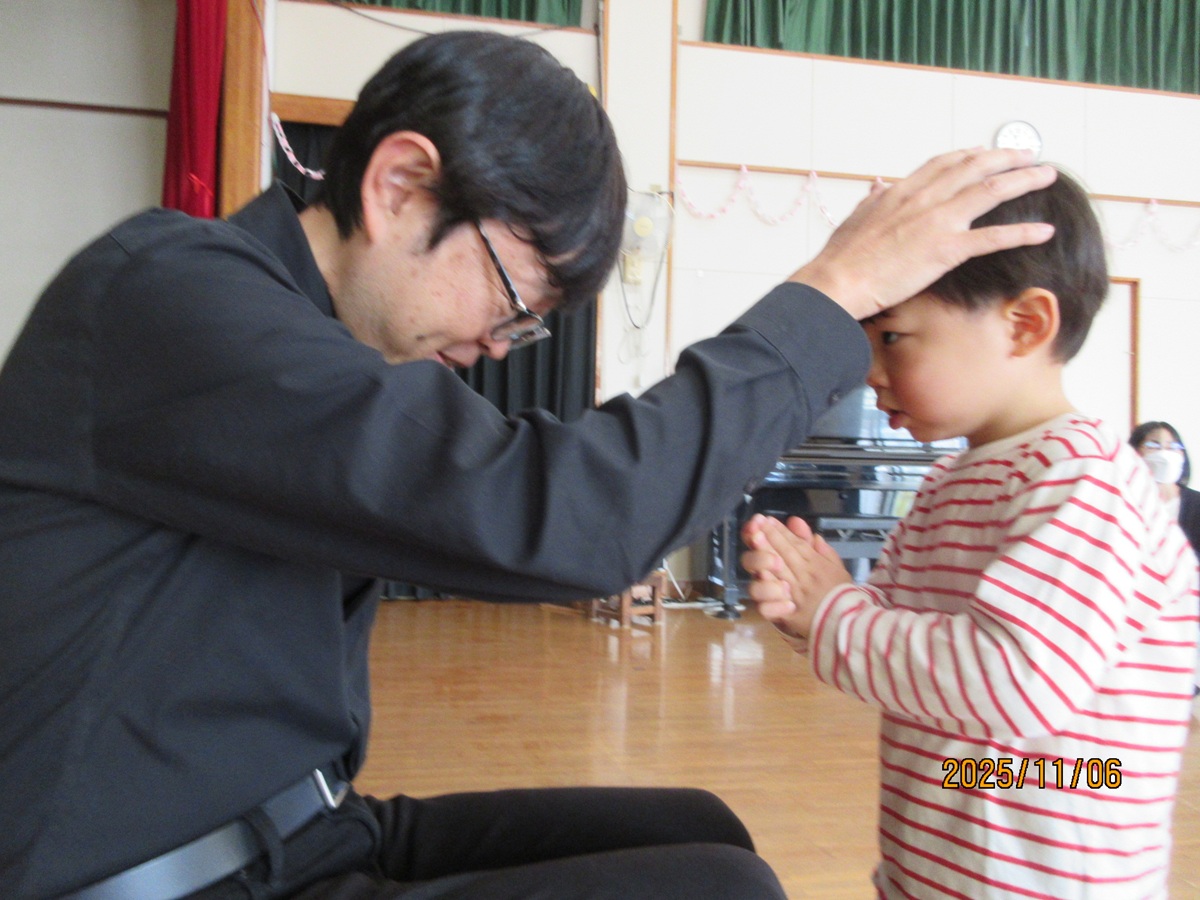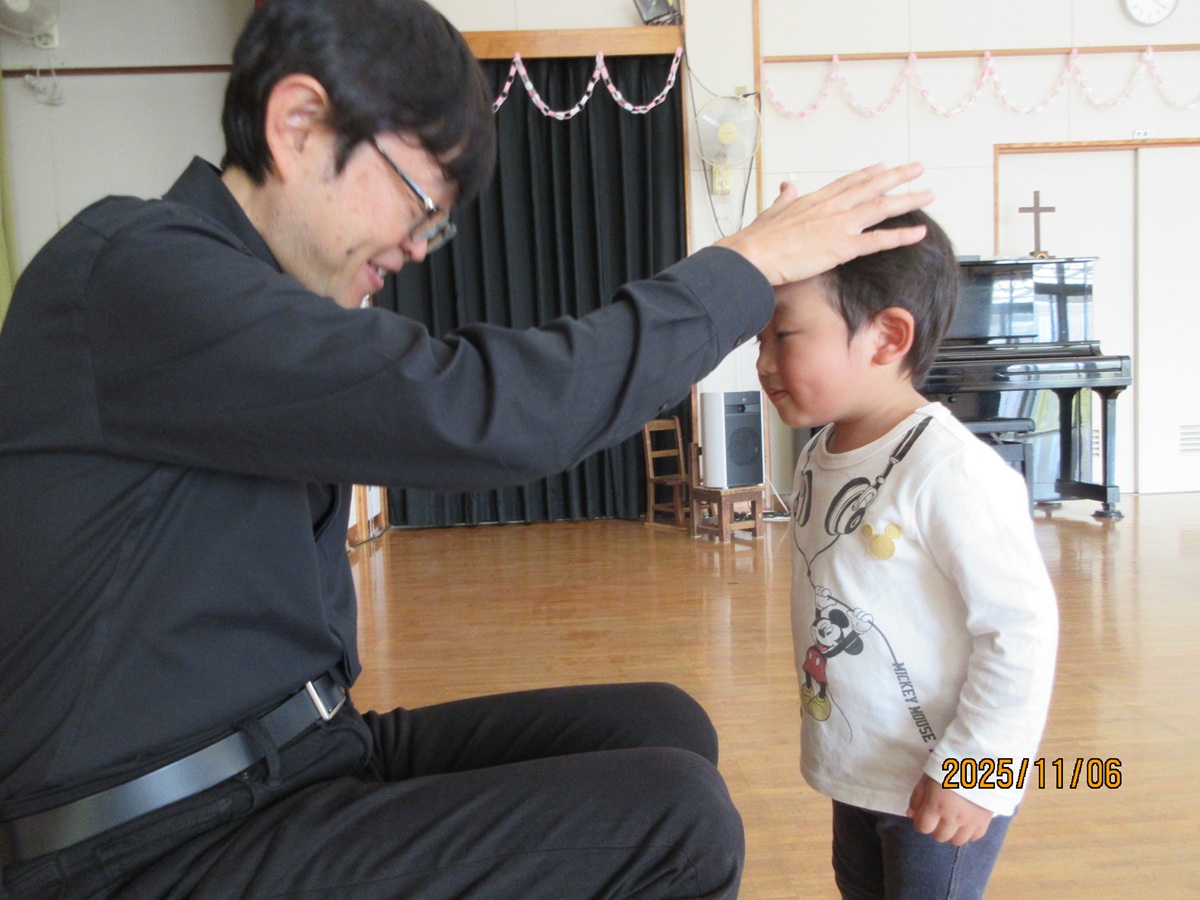 HOME2025年度11月6日(木)ひまわり組(保育部) 子ども祝福式 11月6日(木)ひまわり組(保育部) 子ども祝福式 秋晴れの清々しい空気の中、みんなの健やかな成長を神様に感謝する『子ども祝福式』が行われました。 一人ひとり、園長先生に祝福していただきました ♡ これからも、神様の見守りの中で、もっともっと大きくなれますように !!