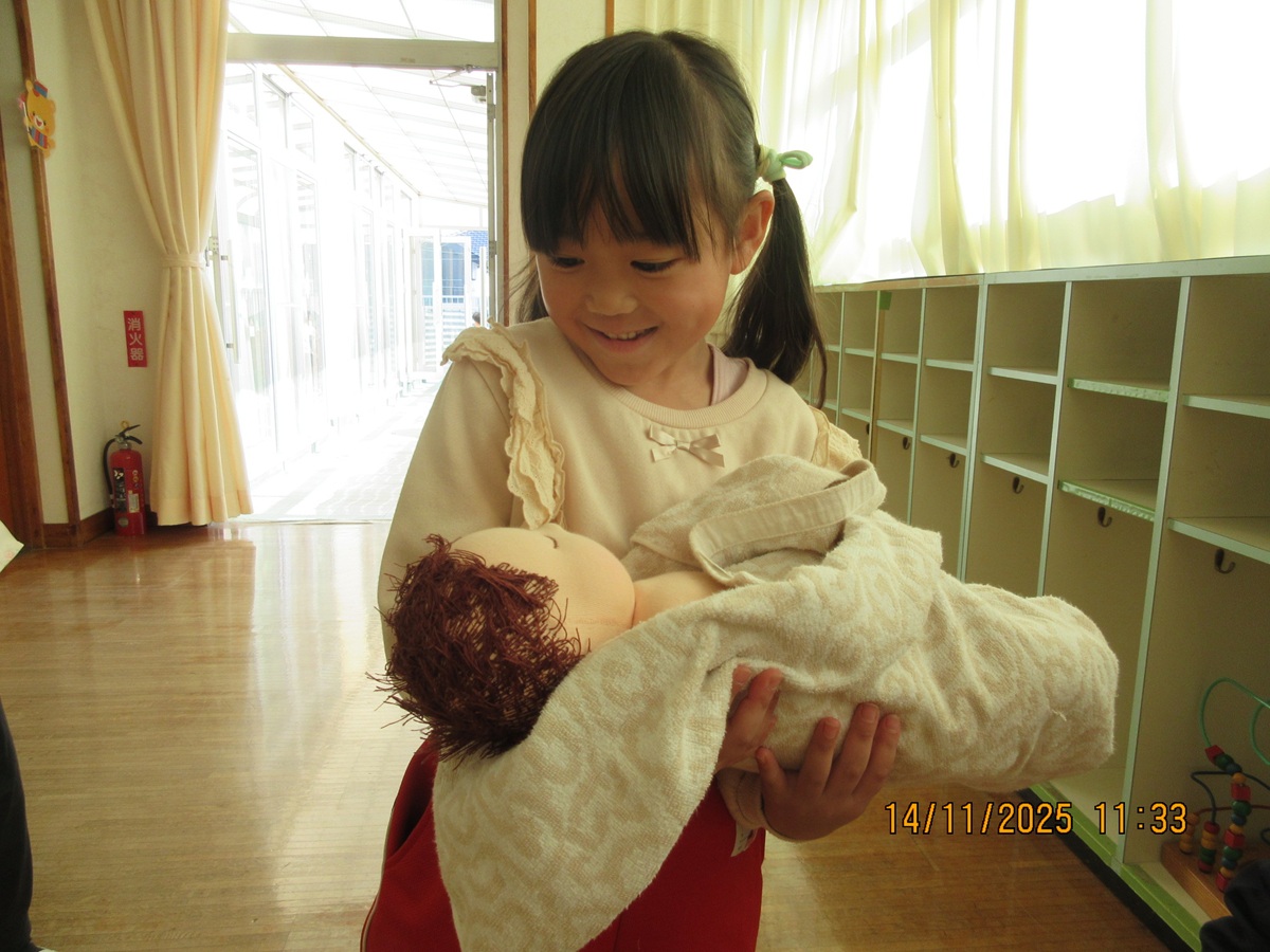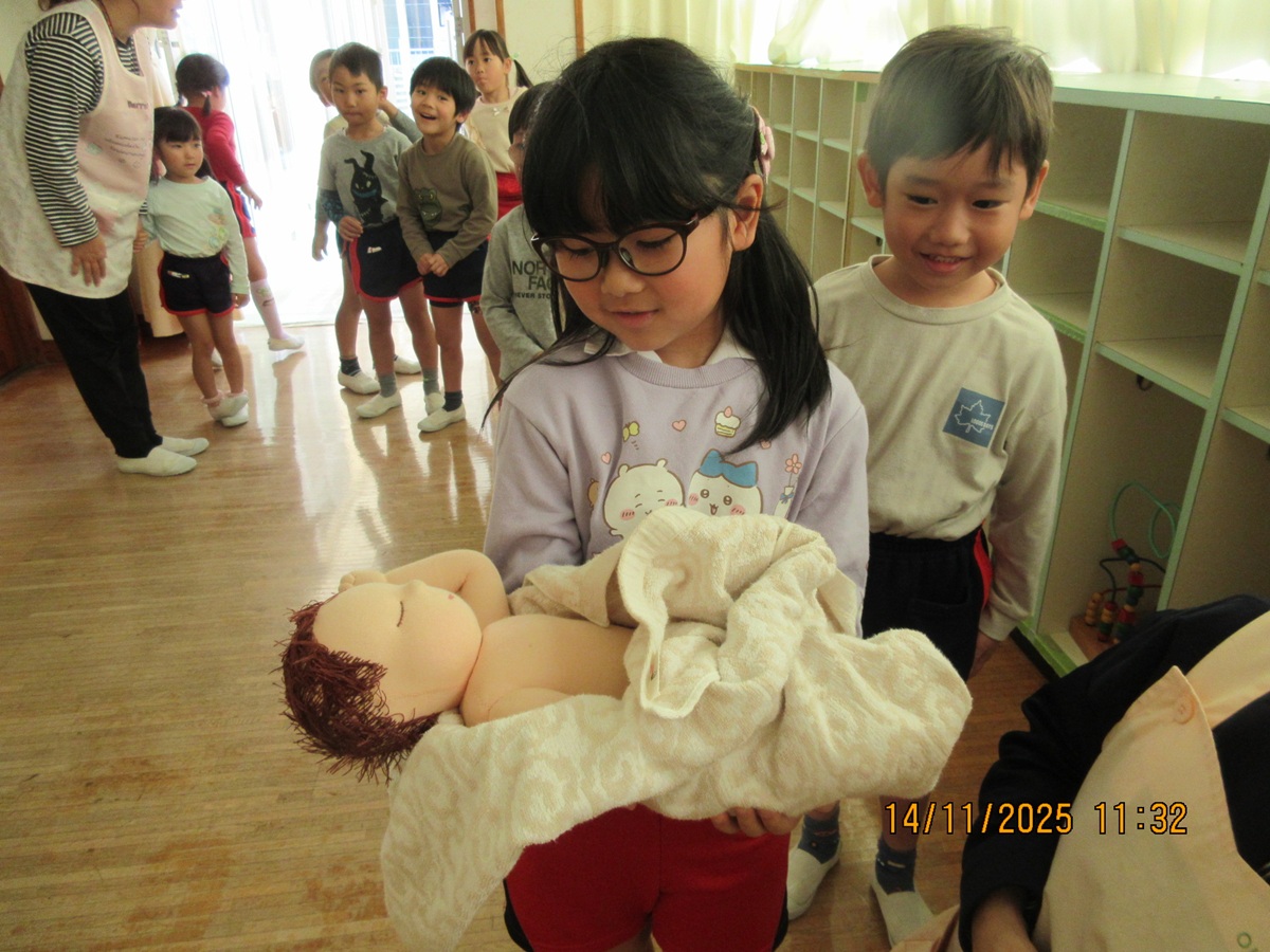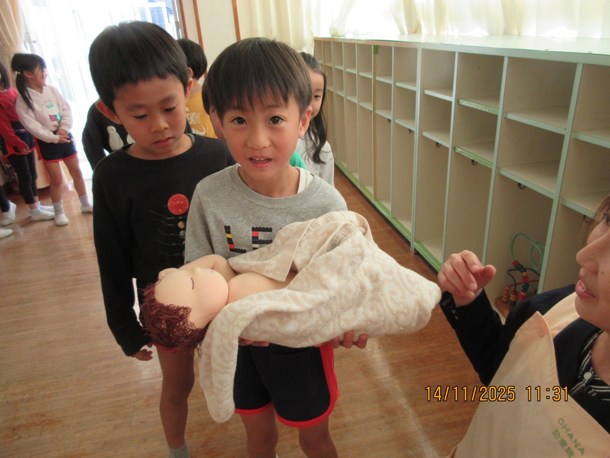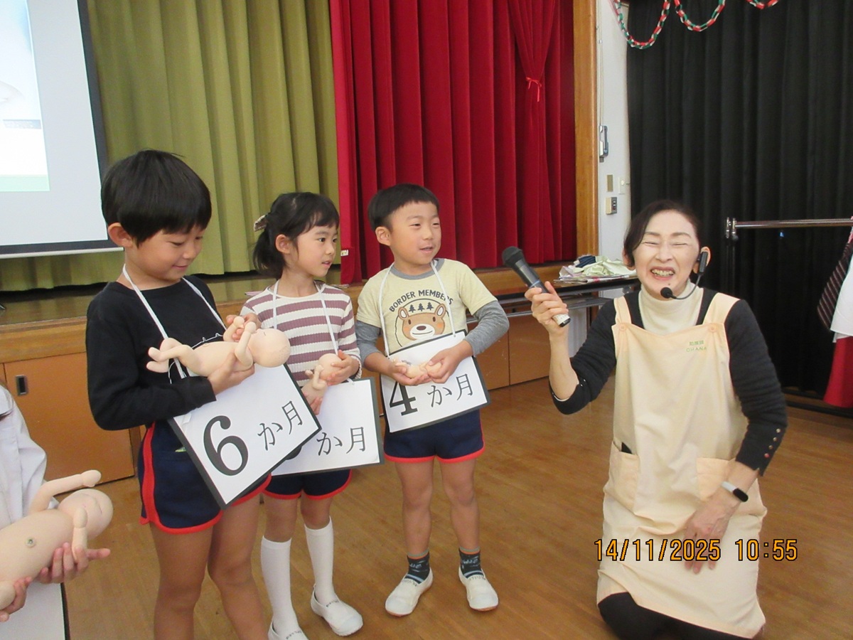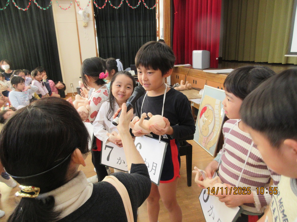 今日は、きく組の子どもたちと保護者の方々が集まり、『「生」教育助産師グルーOHANA』の方々による「いのちの授業」が行われました。米粒ほどの小さな命が、どのようにお母さんのお腹の中で大きくなっていくのかをスライドで教えていただき、子どもたちは「こんなに小さかったんだ!」と驚いていました。赤ちゃん人形を抱っこして重さを感じたり妊婦さんのお腹の重さを体験したり、赤ちゃんの心臓の音を聞かせてもらったりと、命のぬくもりを感じる貴重な体験をたくさんしました。保護者の方が「お子さんと初めて対面した時のお気持ち」を紹介してくださり、生まれてきてくれた喜びと深い愛情に心が温まりました(*^_^*)今日の学びを通して「生まれてきてくれてありがとう」という思いを胸に、命の大切さや生まれてきたことへの感謝を感じることができました。これからも日々の中で「いのち」の尊さを大切にしていきたいと思います。