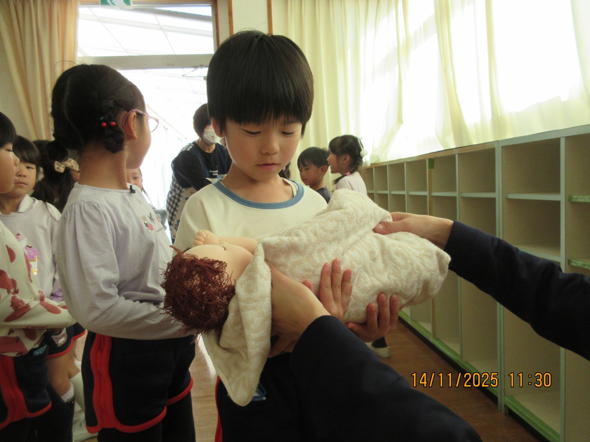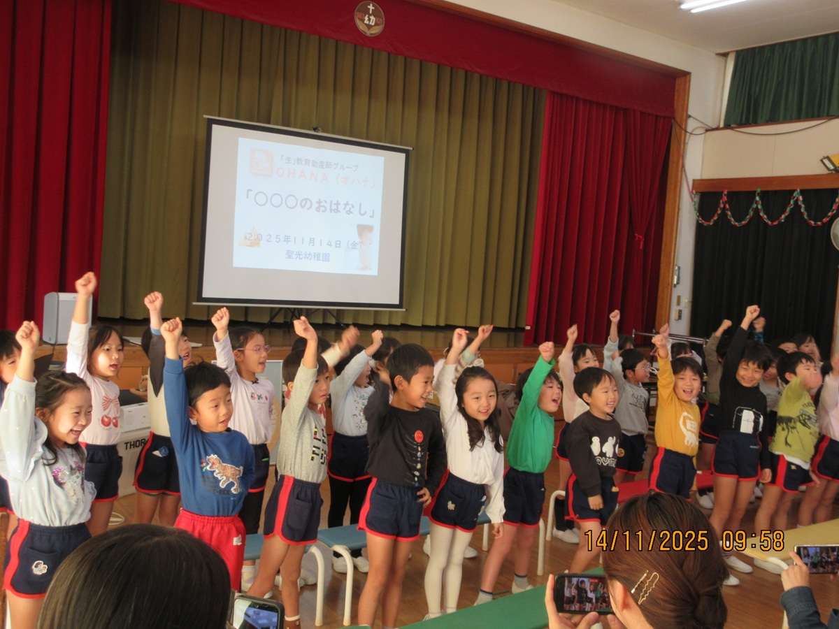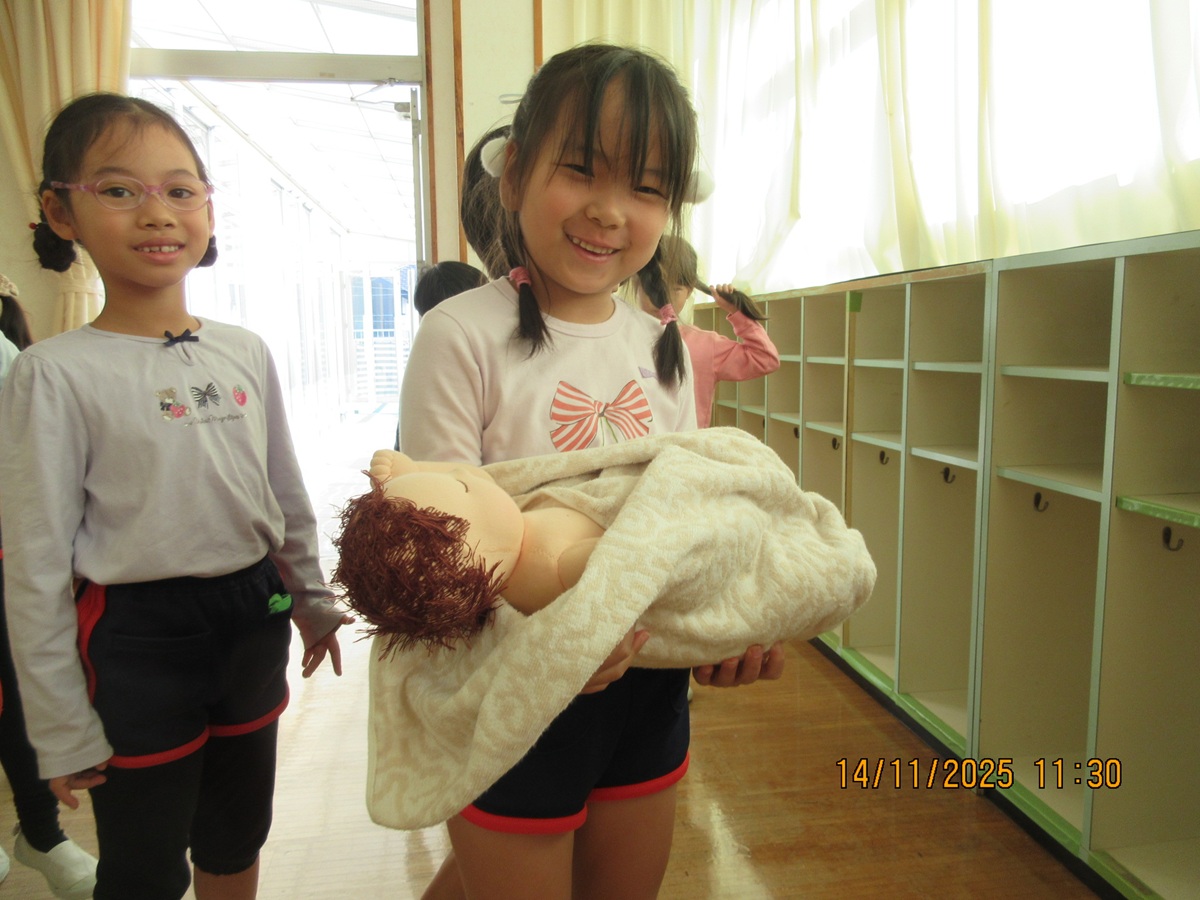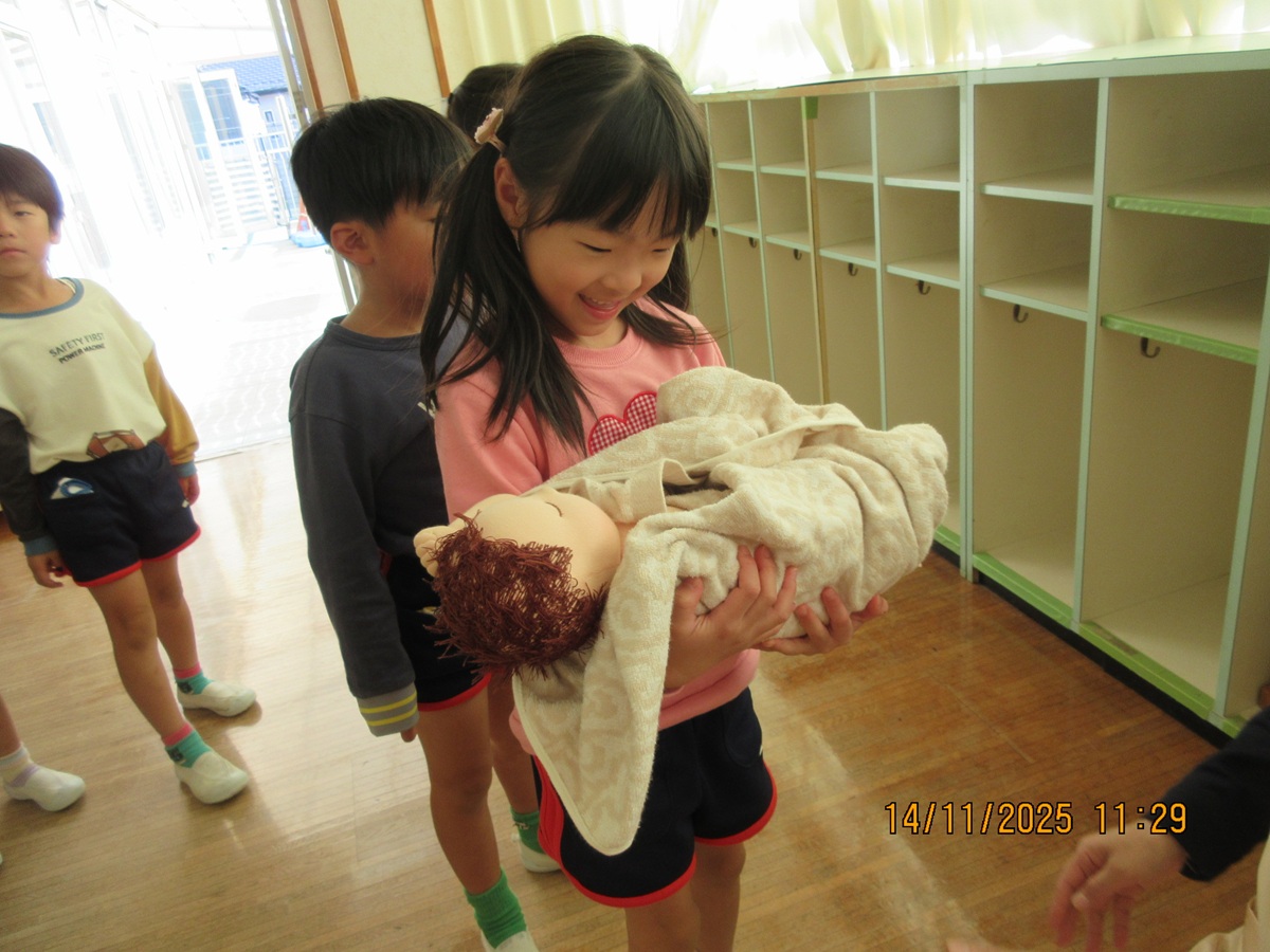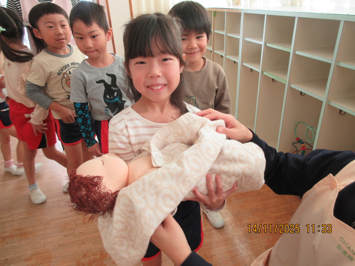 今日は、きく組の子どもたちと保護者の方々が集まり、『「生」教育助産師グルーOHANA』の方々による「いのちの授業」が行われました。米粒ほどの小さな命が、どのようにお母さんのお腹の中で大きくなっていくのかをスライドで教えていただき、子どもたちは「こんなに小さかったんだ!」と驚いていました。赤ちゃん人形を抱っこして重さを感じたり妊婦さんのお腹の重さを体験したり、赤ちゃんの心臓の音を聞かせてもらったりと、命のぬくもりを感じる貴重な体験をたくさんしました。保護者の方が「お子さんと初めて対面した時のお気持ち」を紹介してくださり、生まれてきてくれた喜びと深い愛情に心が温まりました(*^_^*)今日の学びを通して「生まれてきてくれてありがとう」という思いを胸に、命の大切さや生まれてきたことへの感謝を感じることができました。これからも日々の中で「いのち」の尊さを大切にしていきたいと思います。