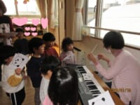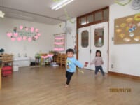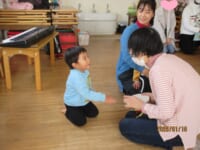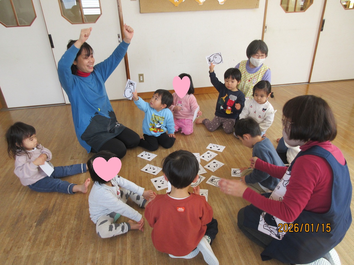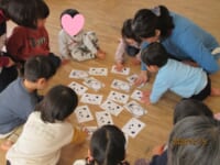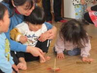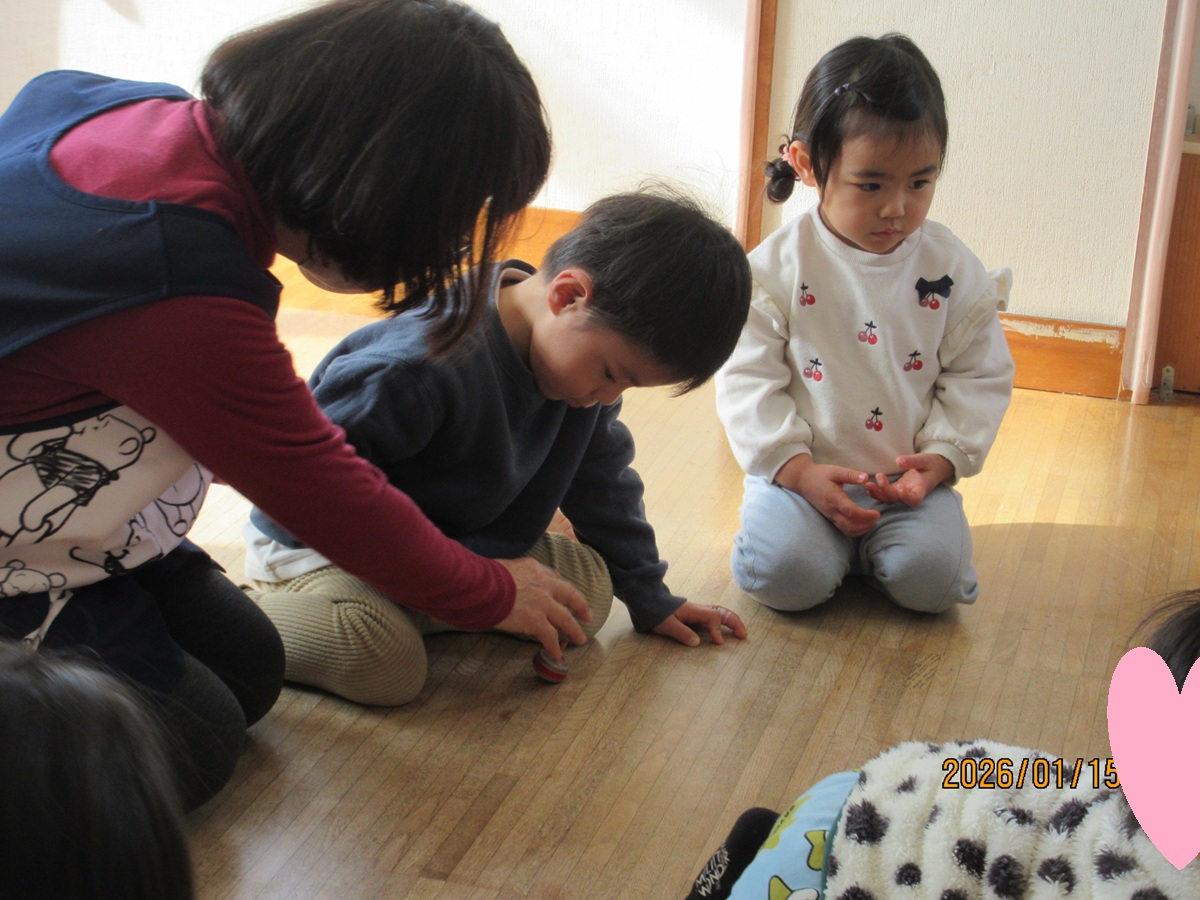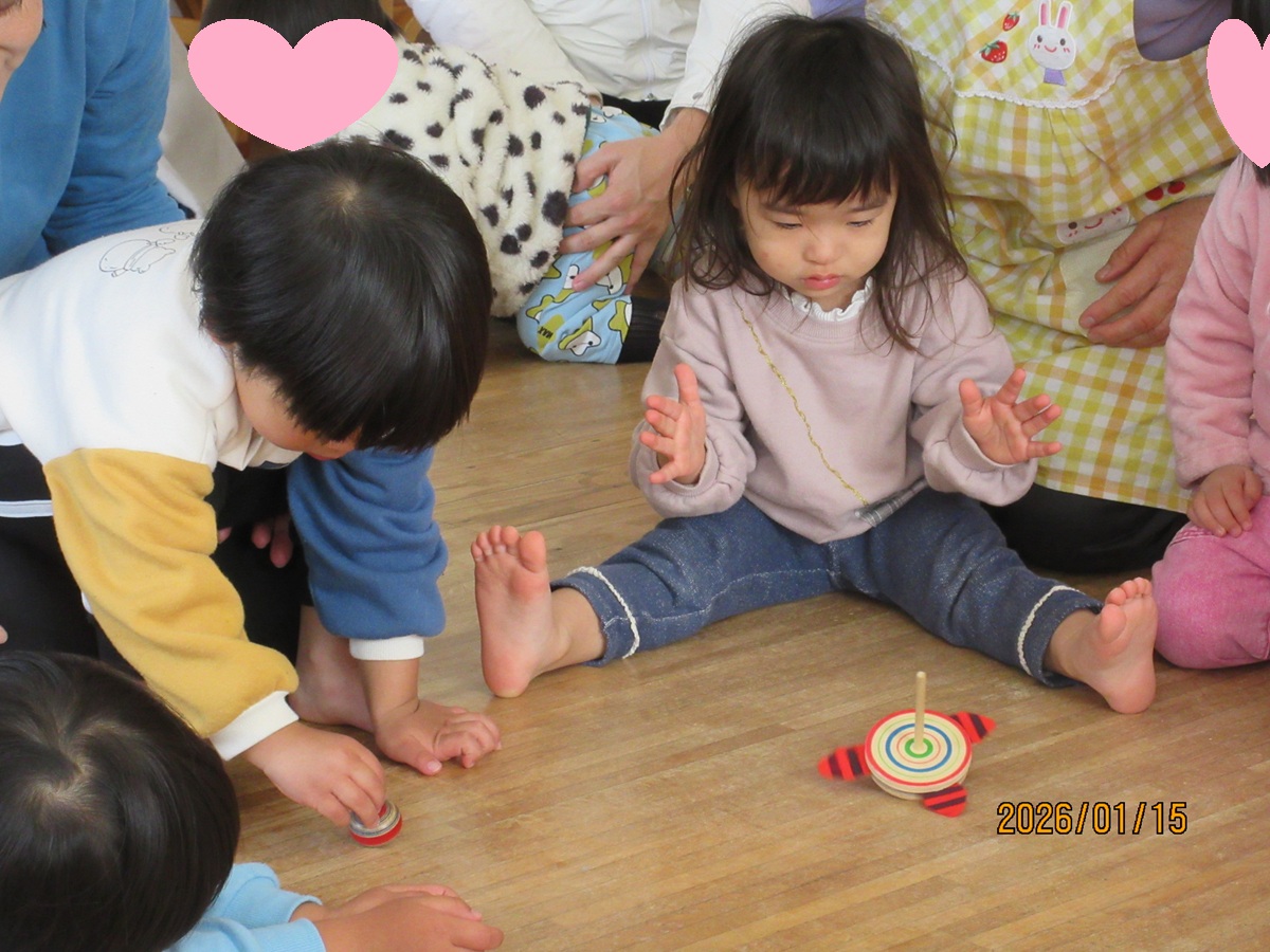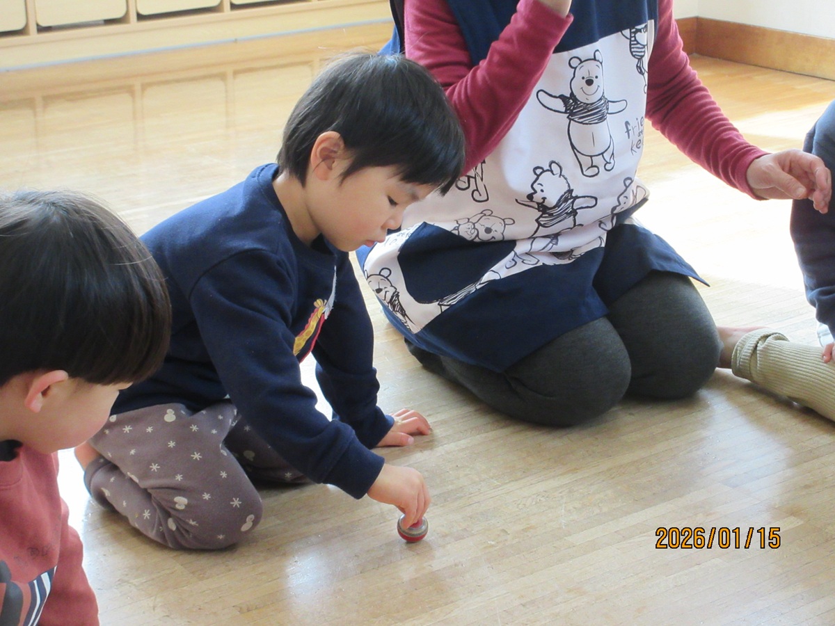 Ⅰ先生がお正月遊びを用意して下さいました。ピアノの演奏に合わせて本物の凧を飛ばしたり、全身で凧を表現しました (^^♪ こま回しは指先を一生懸命使って回そうと真剣 !かるた取りは、リズム遊びを交えながら、楽しみました(^^) 何枚とれたかな~?