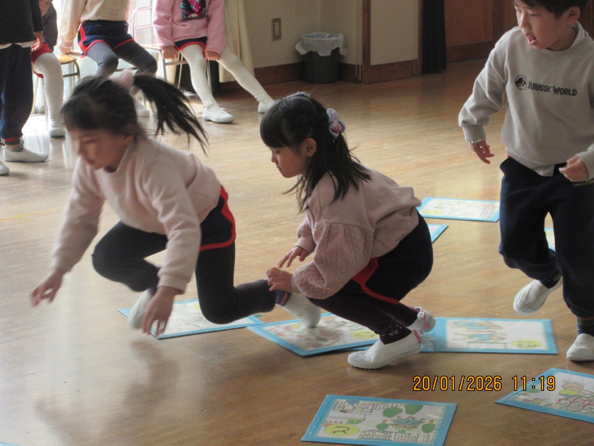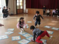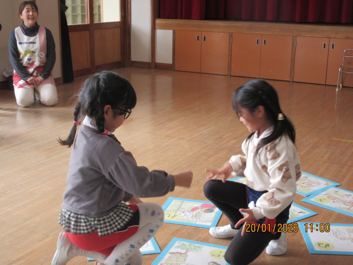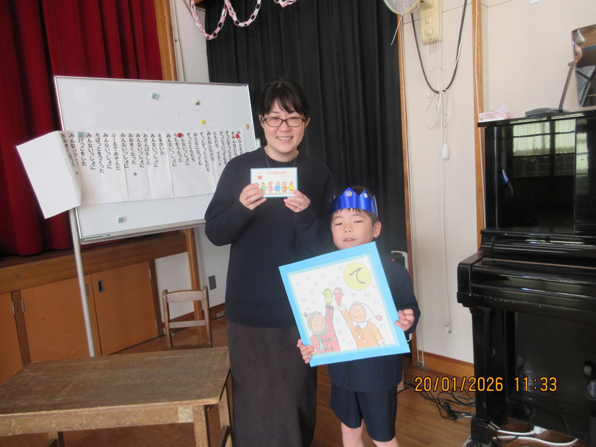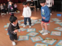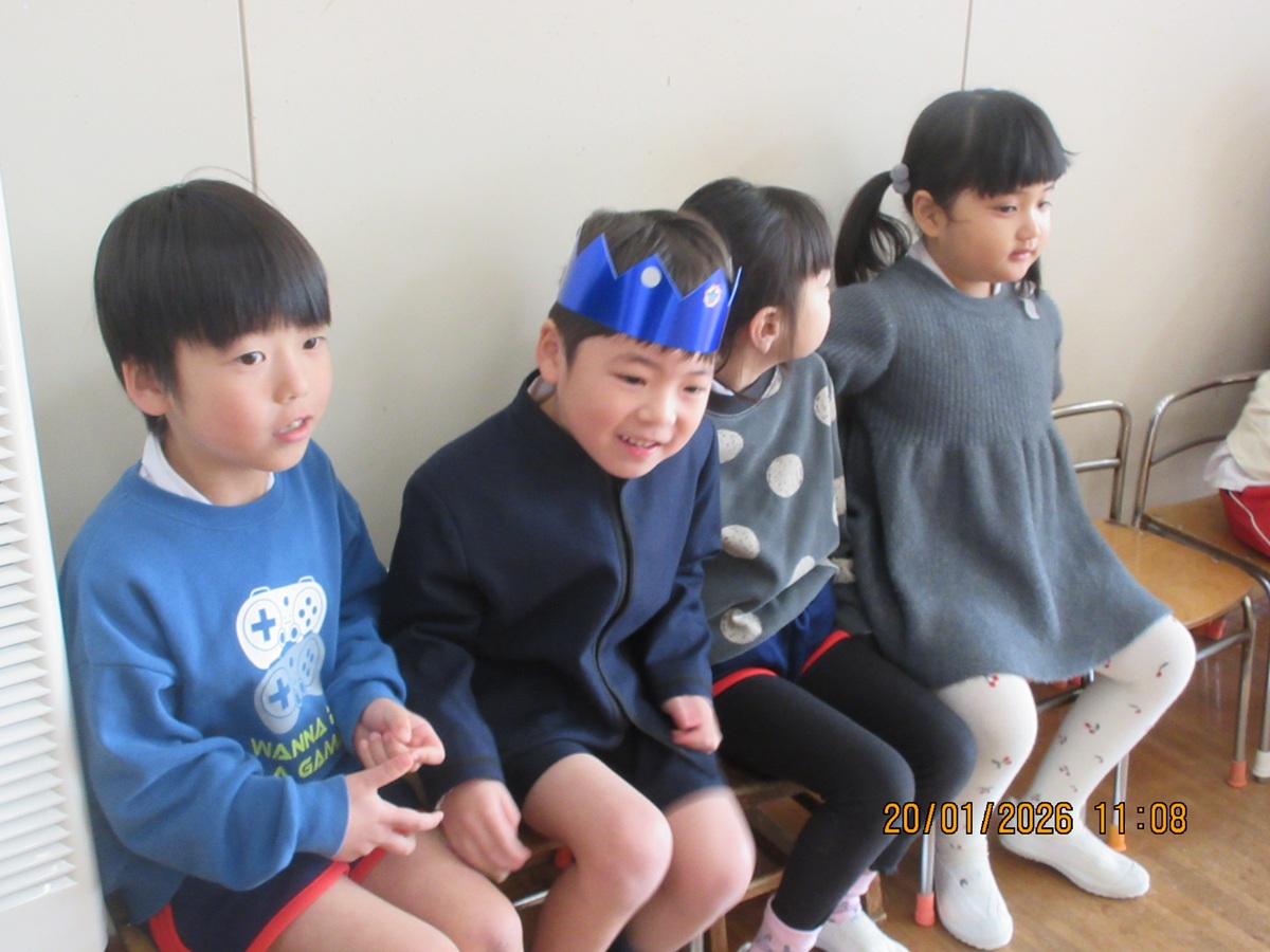 お楽しみ会では、「大型かるた取り」に挑戦しました。お家の方に読み札を読んでいただき、グループ対抗で競いました(^_-)-☆「はい!」と元気な声が響き渡り、グループの仲間同士で励まし合いながら集中する姿は、さすが年長さん‼クラス全体が一体となり、大盛り上がりの時間となりました。