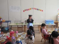 お楽しみの時間には、5つのメロンパンのパネルシアターを見ました♡ふんわり丸くて美味しそう♪なメロンパンに釘付けな子どもたちでした💕パネルシアターを見た後は、さくら組に遊びに来てくれた青くんピンクちゃん黄色ちゃんたちと一緒にかくれんぼをしました。お誕生日のお友だち、お手伝いをありがとう♡楽しい誕生日会になりましたね(*^_^*)