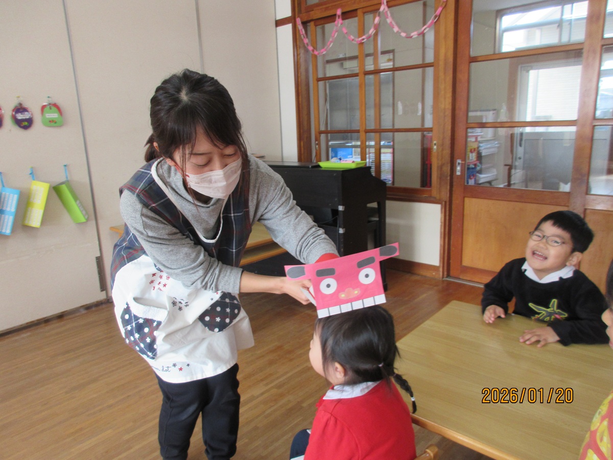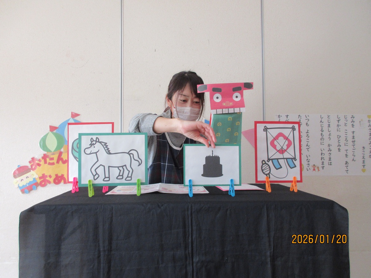 プレゼントの歌の後はお楽しみの時間です。「🎵獅子太郎のなぞなぞかるた🎵」のお話を見ました。獅子太郎がゆり組さんに遊びに来てくれてお正月にちなんだシルエットクイズを出してくれました。正解したお友だちには、獅子太郎から『ガブリ!』と頭を噛むプレゼント💛邪気を食べてもらいました。そして、お正月といえば…おとしだま!獅子太郎が持ってきた大きなお年玉袋から500円玉や1000円札、お母さんにはブラックのクレジットカードが出てきました。お友だちにはとっても喜んでもらえましたよ💛