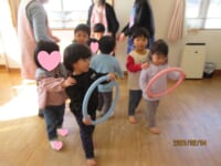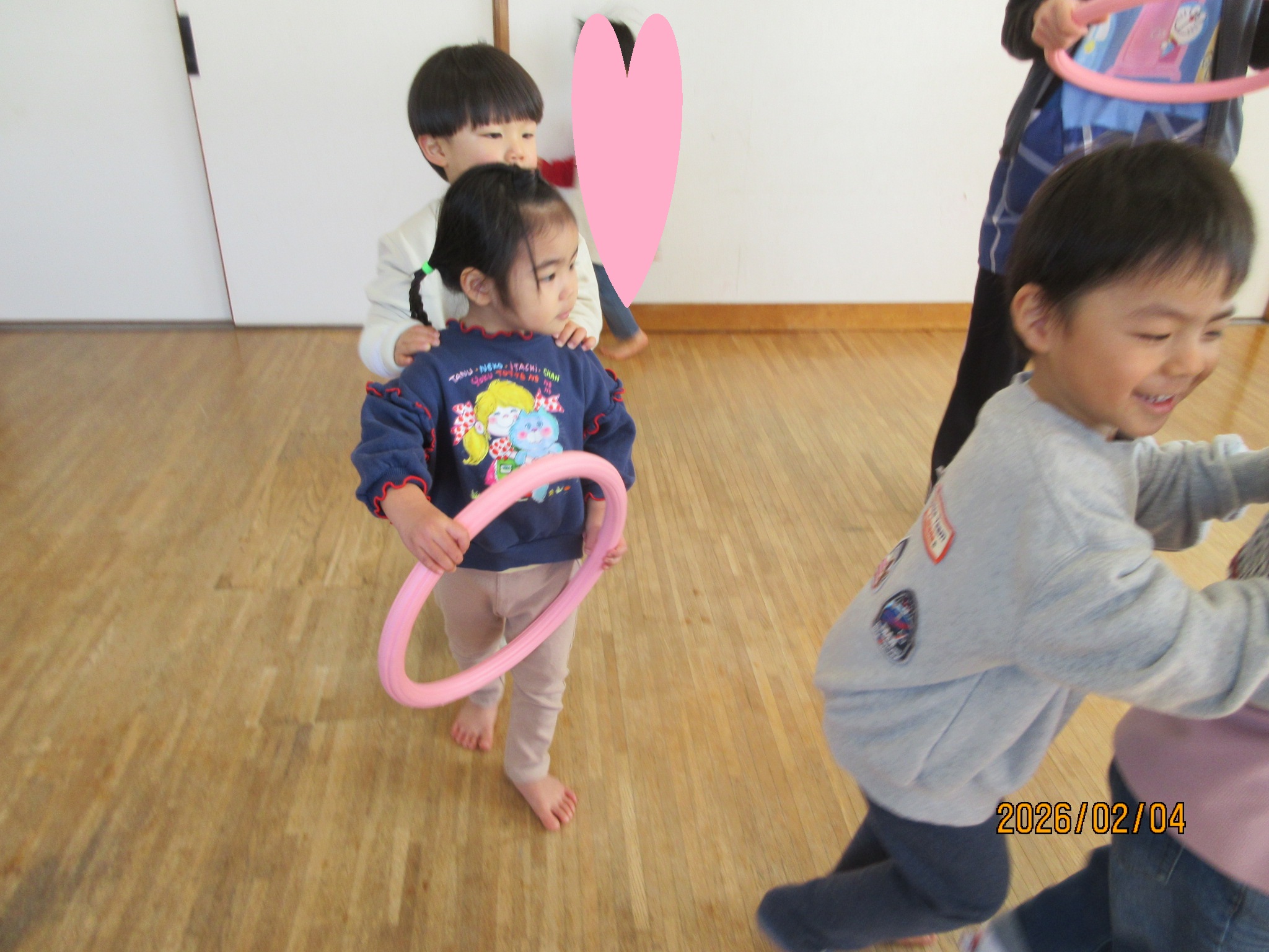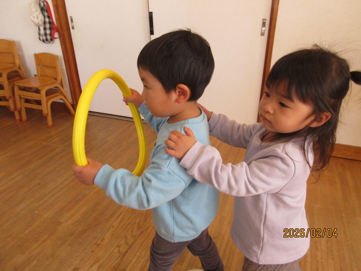 フラフープをハンドルに見立てての運転も、お友だちとリズムを合わせながら走ることができました (^^♪ 順番も自分たちで決めて、交代できたんですよ !!
