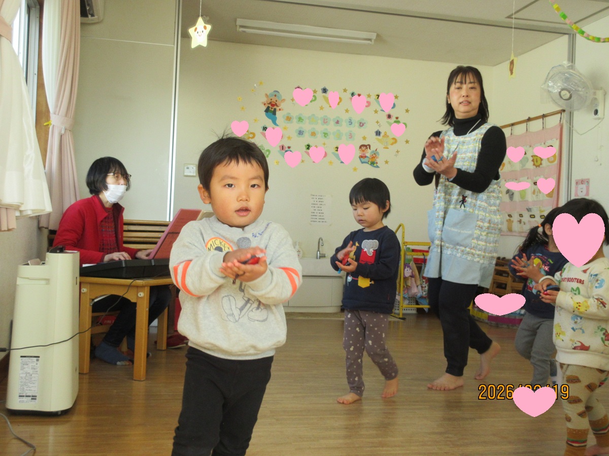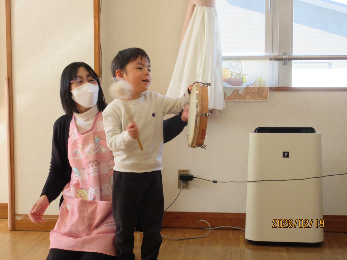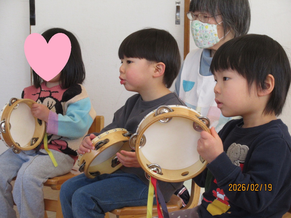 「おおきなたいこ♫」の曲に合わせて、強弱をつけながらタンブリンの演奏に挑戦 !