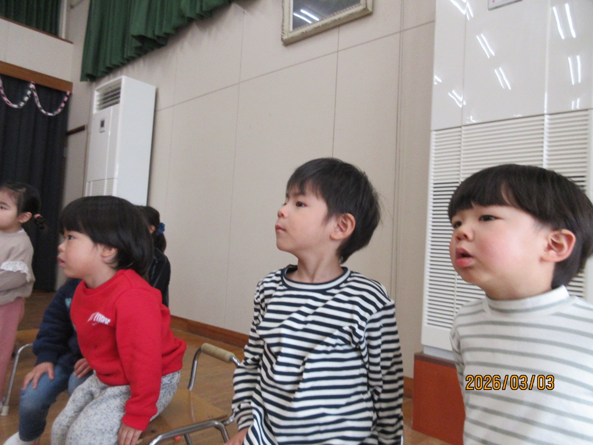ひなまつりにまつわるクイズや、パネルシアターを観劇して、幼稚園のお友だちと楽しい時間を過ごしました (^^♪