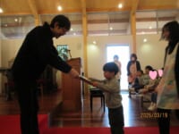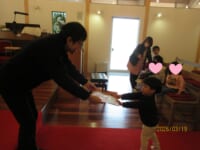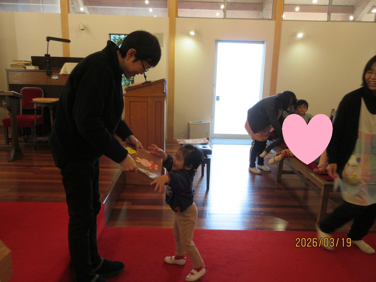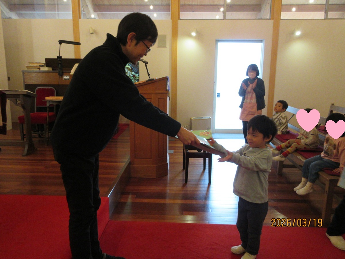 教会で、園長先生からドキドキしながらも一人ひとり前に出て、『おもいで』をいただく姿に成長が感じられました ♡