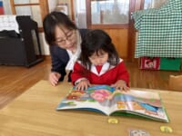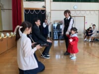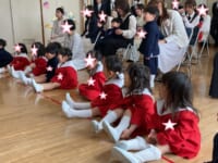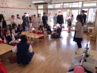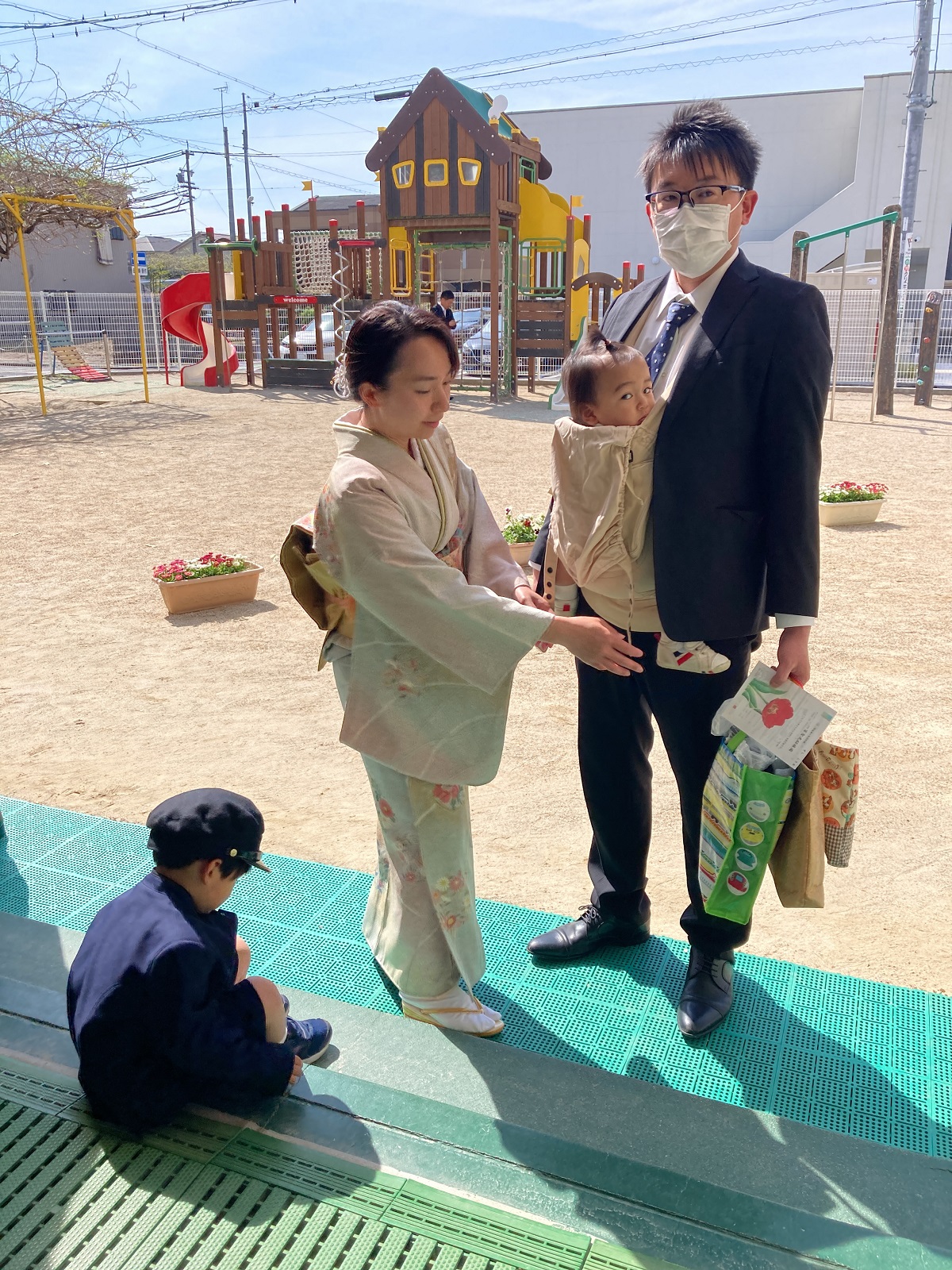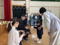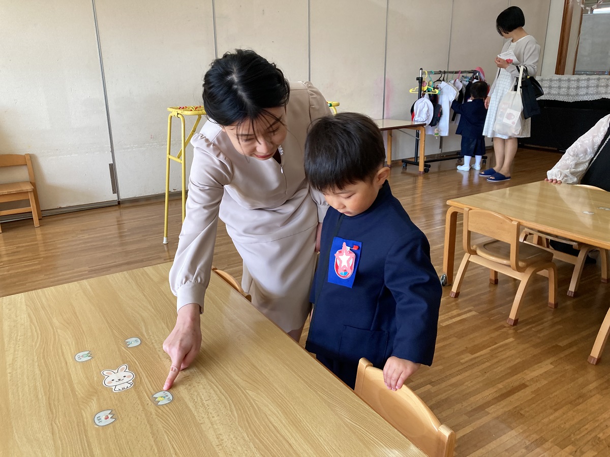 入園式では、保護者の方の膝の上に乗って、お祈りをし、園長先生の話を聞きました。チューリップの歌の手遊びや先生たちによる人形劇もとっても楽しんでいましたね💛園長先生から園バッチをもらって嬉しそうに笑みを浮かべていました。