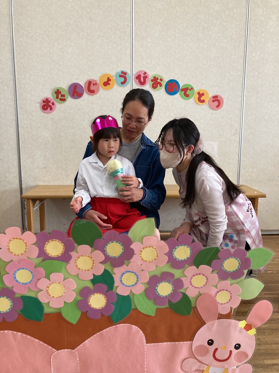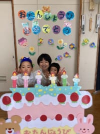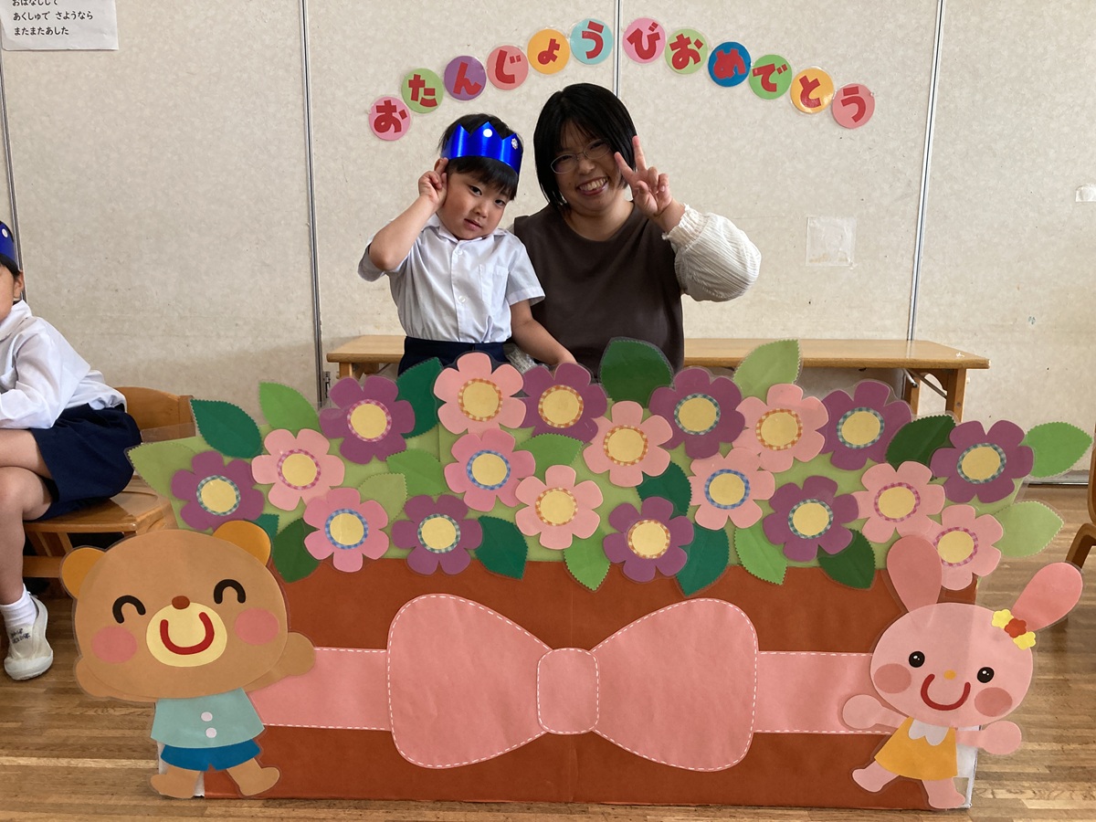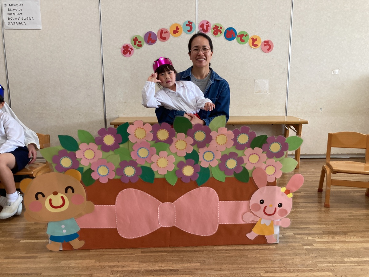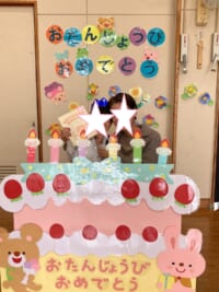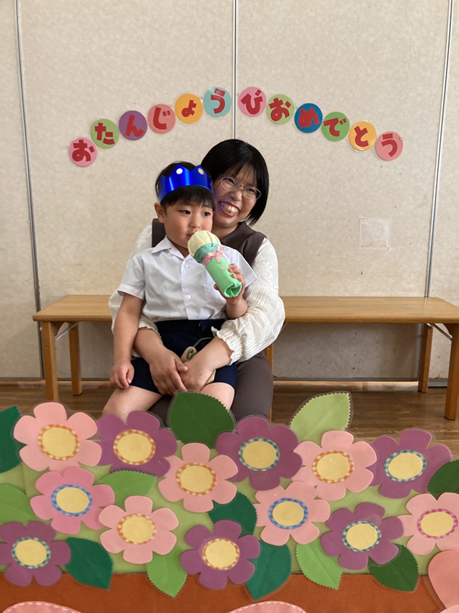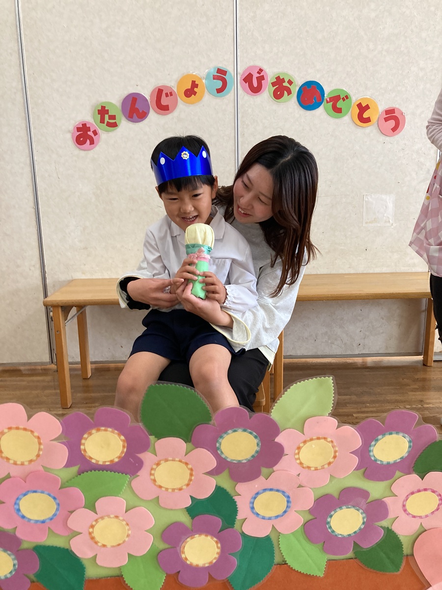 きく組は5人のお友だちのお祝いをしました。インタビューでは「大きくなったら何になりたい」かを聞きました。「高校の先生、パイロット、桃太郎・こまちの運転手、お花屋さん、藤子不二雄ミュージアムで働きたい」とキラキラと目を輝かせて素敵な夢を教えてくれました。みんなの夢が叶いますように・・・♡お家の方からはお子様の名前の由来を教えていただきました。愛情あふれる素敵なお話に感動しました。教えて頂きありがとうございました。