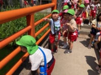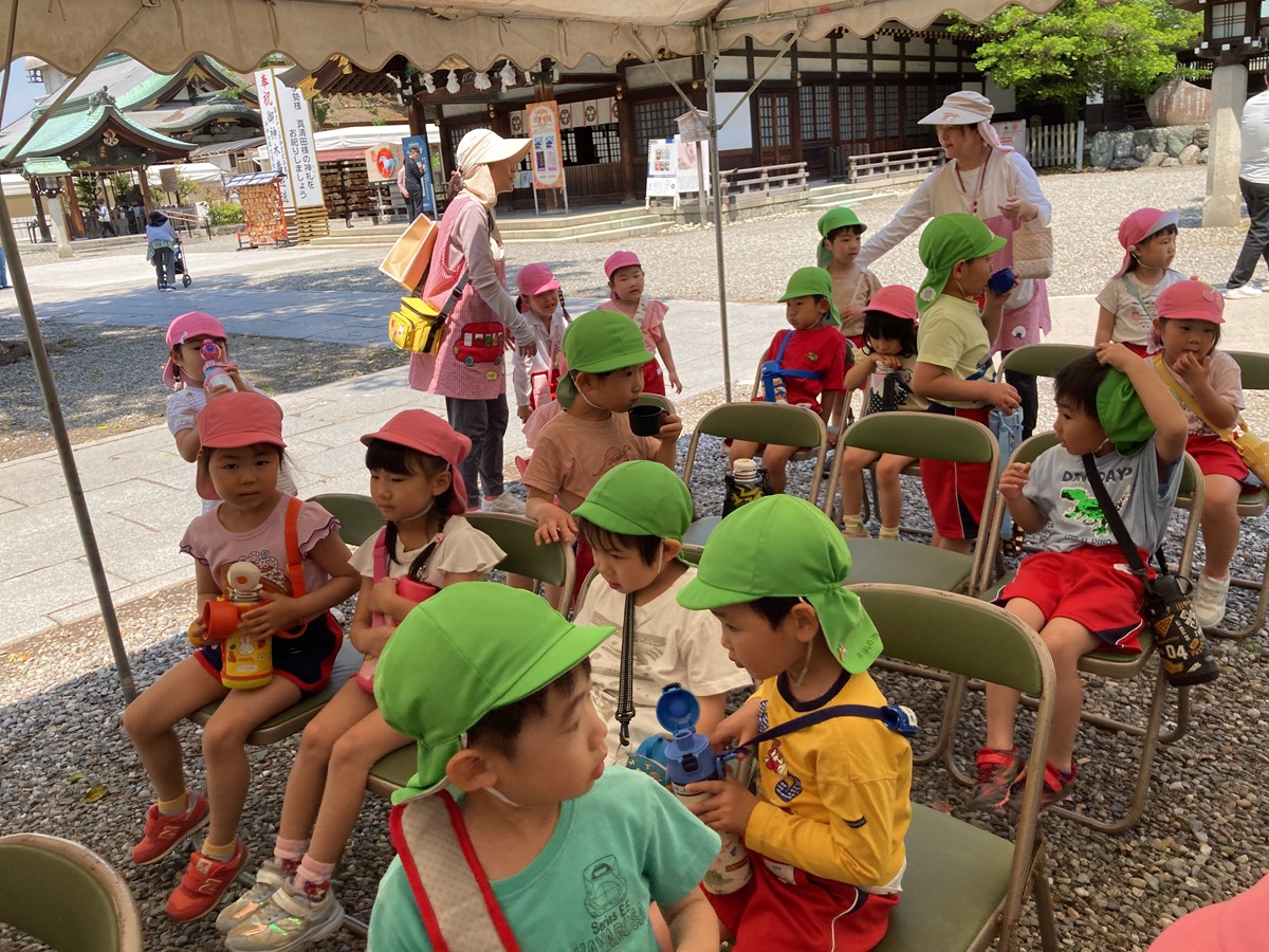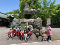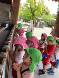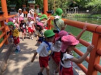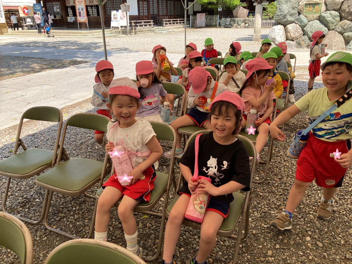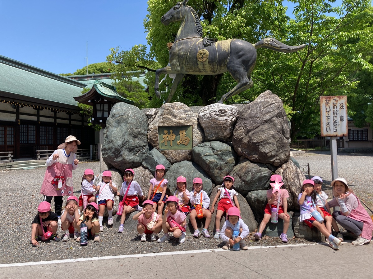 真清田神社ではみんなで手を合わせてお参りをして、お茶を飲んでちょっぴり休憩♡神社の奥にある池では元気に泳ぐ鯉を見てきました。子どもたちは、こいのぼりと鯉はどこが違うんだろう・・・と、不思議そうに色とりどりの鯉に見入っていました(⌒∇⌒)